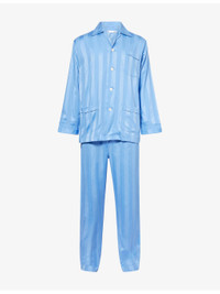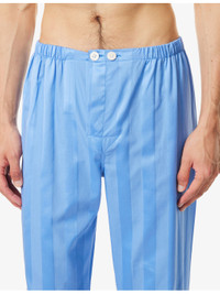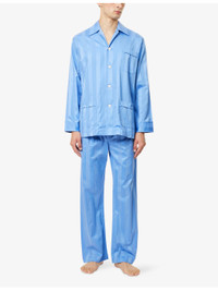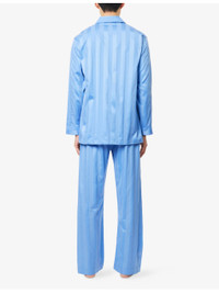 PRODUCT DETAILS - Derek Rose cotton pyjama set - 100% cotton - Button fastening - Exposed button fastenings at front - Top: - Camp collar, long sleeves, one patch pocket at chest, striped - Bottoms: - Relaxed fit, mid rise, straight leg, elasticated drawstring waistband, slip pockets, striped - Machine wash mild - Model is 6ft 2in/1.88m and wears a size medium - Lightweight, non-stretch Ref: R04513402