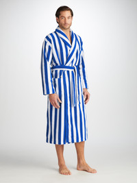 Our Aston bathrobe is a customer favourite, seen here with classic blue and white stripes, it features a classic shawl collar and two side pockets for practicality while around the house. It's fastened with a fabric tie belt for the perfect fit. A cut back yarn on the outside gives it the soft velour finish, with a rich and lustrous appearance, whilst the looped 'towelling' yarns inside are designed to maximise absorption of water and enhance the drying quality of this bathrobe. You'll be dry and comfortable in no time. To make it truly special , we can personalise your bathrobe with initials or a motif. Read more about our personalised services here . The model is 6’1” / 188cm tall with waist size 31” / 80cm, chest size 39” / 101cm. He wears a size Medium. Click here for our full range of Men's Gowns. PRODUCT DETAILS Material: Cotton/Polyester Fabric Weight: Medium Fabric Type: Velour Gender: Men's Colour: Blue Pattern: Stripe Sleeve Length: Long Sleeve Season: 24-W Country of Origin: Portugal Composition: 90% Cotton 10% Polyester Fit: Relaxed Fit Item Number: 5705-ASTO031BLU