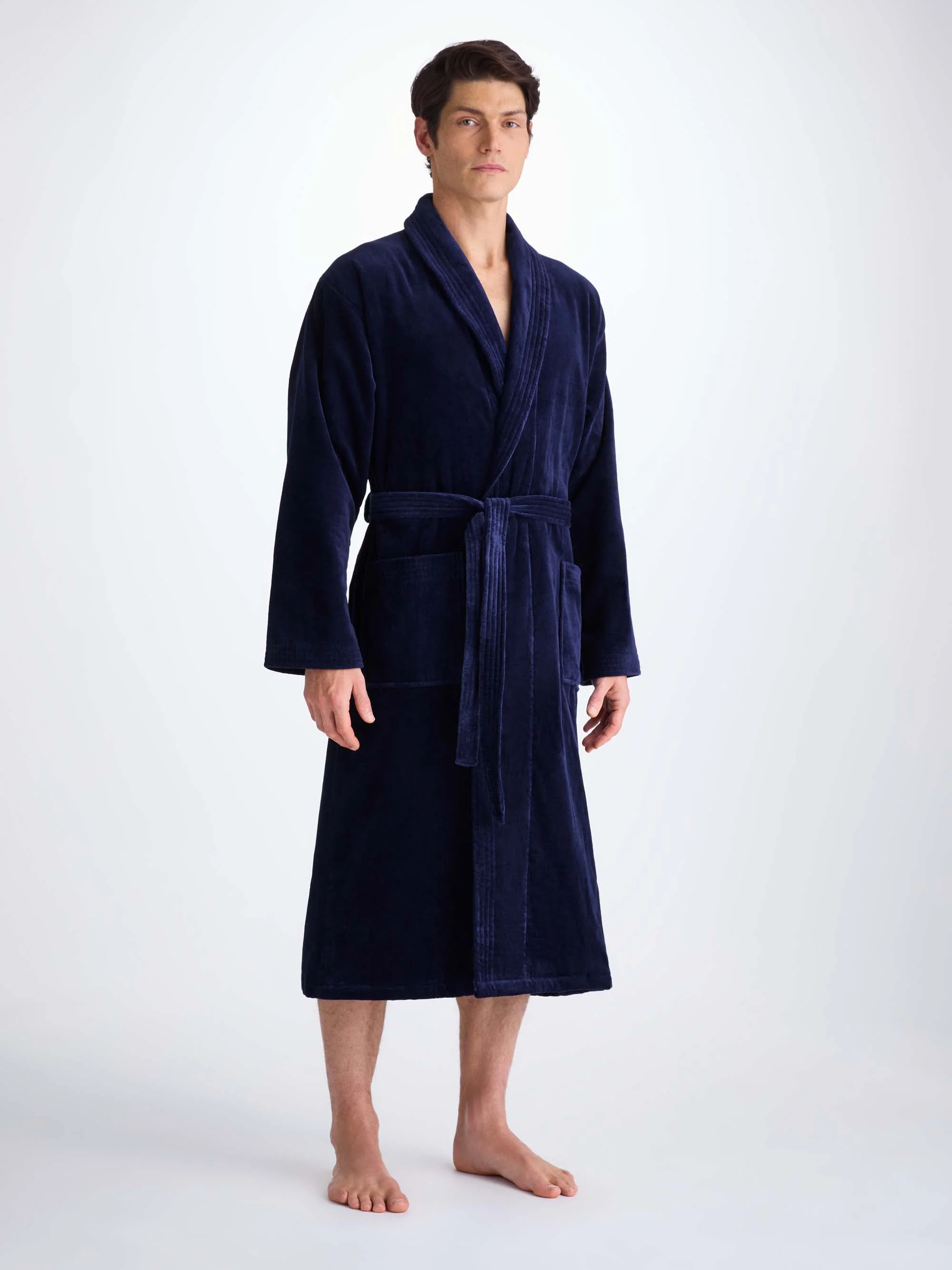 Our Triton bathrobe is a customer favourite, it features a classic shawl collar and two side pockets for practicality while around the house. It's fastened with a fabric tie belt for the perfect fit. A cut back yarn on the outside gives it the soft velour finish, with a rich and lustrous appearance, whilst the looped 'towelling' yarns inside are designed to maximise absorption of water. You'll be dry and comfortable in no time. To make it truly special , we can personalise your bathrobe with initials or a motif. Read more about our personalised services here . The model is 6'2" / 186cm tall with waist size 30” / 76cm, chest size 39” / 99cm. He wears a Medium. Click here for our full range of Men’s Dressing Gowns. PRODUCT DETAILS Material: Pure Cotton Fabric Weight: Medium Fabric Type: Velour Gender: Men's Colour: Navy Pattern: Plain Sleeve Length: Long Sleeve Season: CLA Country of Origin: Turkey Composition: 100% Cotton Fit: Relaxed Fit Item Number: 5700-TRIT010NAV