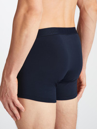 Our Jack boxer briefs in navy are cut for a streamlined, classic look with a fitted hipster shape, closed front and a shorter leg. A fabric-covered waistband provides gentle skin contact. Crafted from an ultra-soft blend of 92% Pima cotton and 8% elastane for added stretch, they're the ideal choice for sleeping, lounging and all-day wear. The model is 6' 1 " / 18 5 cm tall with waist size 3 1 ” / 79 cm, chest size 38 ” / 9 6 cm. He wears a size Medium . PRODUCT DETAILS Material: Cotton/Elastane Fabric Weight: Light Fabric Type: Jersey Gender: Men's Colour: Navy Pattern: Plain Season: CLA Country of Origin: Albania Composition: 92% Cotton 8% Elastane Fit: Regular Fit Item Number: 8565-JACK001NAV