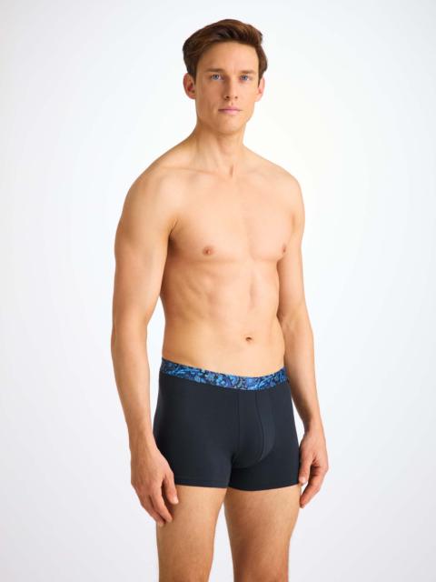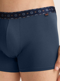 Streamlined fit with a heritage-inspired waistband. Marking 100 years of Derek Rose, these men's boxer briefs feature a classic foulard rose motif along the waistband, adding a refined detail to a modern essential. Cut with a shorter leg and closed front, they offer a sleek, supportive silhouette. Manual welt hems and minimalist lines ensure smooth contact, while the fabric-lined waistband enhances comfort. Made from a premium blend of Pima cotton and stretch elastane, the fabric is exceptionally soft, breathable and flexible, ensuring a perfect fit that moves with you. Superfine threads further elevate the finish for everyday luxury. Designed with both comfort and style in mind, these boxer briefs embody our philosophy of feel-good living. Model is 6’3” / 190cm, wearing a size Medium. PRODUCT DETAILS Composition: 92% Cotton 8% Elastane Fabric Weight: Light Pattern: Print Country of Origin: Albania Item Number: 8635-BAND067NAV