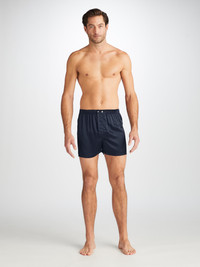 Designed for a more generous fit, our classic fit boxers feature a back panel to avoid the uncomfortable rear centre seam; ideal for those who prefer more coverage and a relaxed shape. The waistband is also fully elasticated and can be adjusted using the traditional two-button fly. Handmade in our workshop in Cheshire, England, our men's Bailey boxers are crafted from luxurious pure Italian silk. With a super-soft, extra lightweight feel, they'll make the everyday seem that little bit more special. The model is 6’1” / 188cm tall with waist size 31” / 80cm, chest size 39” / 101cm. He wears a size Medium. PRODUCT DETAILS Material: Pure Silk Fabric Weight: Light Fabric Type: Regular Gender: Men's Colour: Navy Pattern: Plain Season: 24-W Country of Origin: United Kingdom Composition: 100% Silk Fit: Regular Fit Item Number: 6030-BAIL001NAV