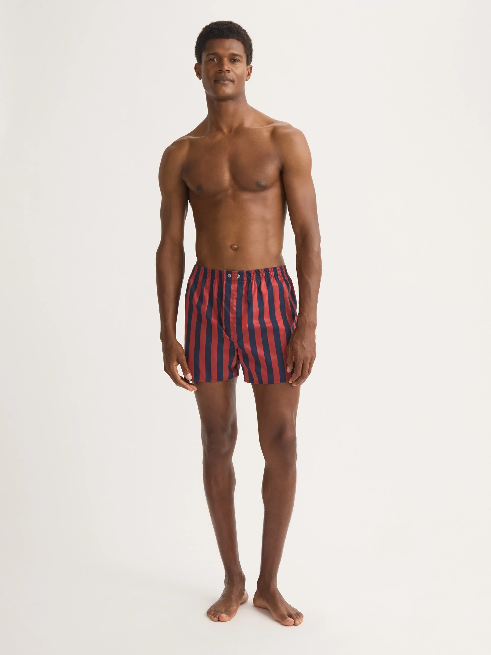 Classic stripes, exceptional comfort Timeless and refined, our Royal Cotton boxers in navy and red stripe bring a touch of luxury to everyday essentials. Cut from our signature pure cotton, the fabric is lightweight, breathable, and supremely soft — keeping you cool and comfortable all year round. Originally inspired by our pyjama designs, these boxers are made to the same exacting standards. The classic fit offers a more generous cut for ease of movement and features a back panel that eliminates the central seam for enhanced comfort. The elasticated waistband with a two-button adjustable fly ensures a secure and personalised fit. A versatile staple for the modern wardrobe, these boxers combine heritage craftsmanship with enduring quality. Model is 6’2” / 189cm tall, wearing a size Medium. PRODUCT DETAILS Composition: 100% Cotton Fabric Weight: Medium Pattern: Stripe Country of Origin: Czech Republic Item Number: 6000-ROYA225NAV