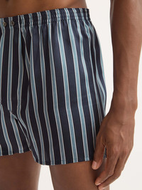 Luxurious silk with a timeless stripe design. Crafted from our exclusive seasonal silk stripe, these men's boxer shorts feature classic navy and blue tones for a refined menswear look. Digitally printed in Italy on the finest mulberry silk, the fabric has a smooth silk finish that feels as indulgent as it looks. Cut in our classic fit, they offer a generous shape and feature a back panel that removes the central rear seam for a smoother, more comfortable feel. A fully elasticated waistband with a traditional two-button fly, inspired by our heritage pajamas, ensures adjustability and ease. Handmade with meticulous attention to detail, these silk boxers combine luxurious fabric with timeless craftsmanship, creating underwear that’s both practical and decadent. Model is 6’2” / 189cm, wearing a size Medium. PRODUCT DETAILS Composition: 100% Silk Fabric Weight: Light Pattern: Stripe Country of Origin: United Kingdom Item Number: 6030-BRIN123NAV