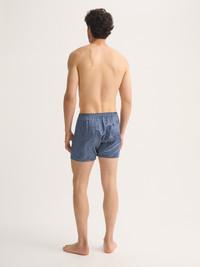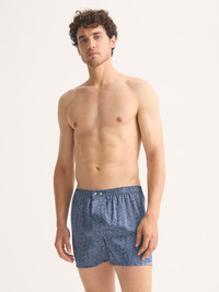Pure silk. Refined comfort. Timeless design. Crafted from the finest mulberry silk and digitally printed in Italy, our rose motif men's boxer shorts feature an elegant navy and blue design that blends classic style with modern sophistication. The smooth silk finish delivers a lustrous sheen and an indulgent feel against the skin. Cut in our signature classic fit, they offer a generous shape with a back panel that eliminates the central rear seam for superior comfort. The fully elasticated waistband and traditional two-button fly — inspired by our heritage pyjama design — ensure adjustability and ease of wear. Handmade with meticulous care, these silk boxers embody the essence of Derek Rose craftsmanship: luxurious, durable and effortlessly refined. Model is 6’2” / 189cm, wearing a size Medium. PRODUCT DETAILS Composition: 100% Silk Fabric Weight: Light Pattern: Print Country of Origin: United Kingdom Item Number: 6030-BRIN124NAV