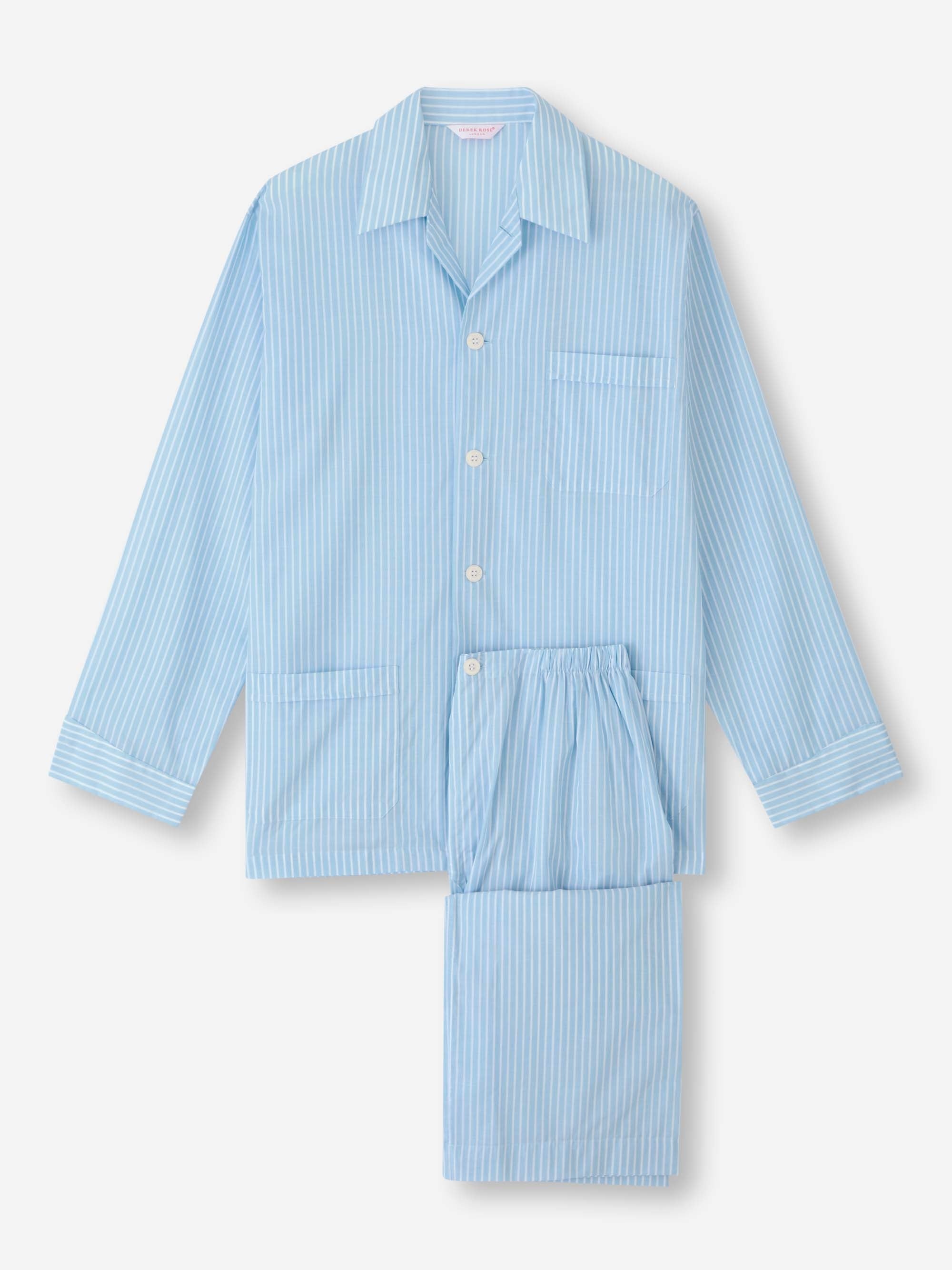 The Amalfi pyjamas feature a three pocket jacket, classic collar and adjustable two-button waistband. Elasticated sides on the trousers mean the front and back are flat for your comfort. The relaxed fit and light cotton batiste fabric will help you drift off into a good night's sleep during the warmer months. The Amalfi is super-soft which is perfect for the warmer time of year, or for centrally-heated homes. This lightweight fabric has a soft finish and a plain, open weave that is designed to be ultra-smooth on the skin and extremely breathable. Our Amalfi cotton has been part of our brand since 1980 when Derek Rose embarked on a search for lightweight fabrics. It has truly passed the test of time. Wash and wear this pyjama set for years to come because this fabric lasts wonderfully well. Complete with a soft sky blue and white stripe. To make it truly special, we can personalise your garment. We offer a range of options including monogramming, motifs, and secret messages. Read more about our personalised services here . The model is 6'1" / 185cm tall. He wears a size Medium. PRODUCT DETAILS Material: Pure Cotton Fabric Weight: Light Fabric Type: Regular Gender: Men's Colour: Light Blue Pattern: Stripe Sleeve Length: Long Sleeve Season: 25-W Country of Origin: Czech Republic Composition: 100% Cotton Fit: Relaxed Fit Item Number: 5000-AMAL021BLU