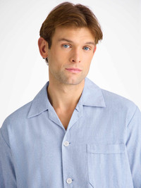 Our Arran pyjamas are styled for a relaxed and comfortable fit for pure free time bliss. They feature a three-pocket pyjama top, classic collar and adjustable two-button waistband with open fly. Elasticated sides on the trousers mean the front and back are flat for your comfort. These pyjamas feature a refined herringbone stripe design that adds a touch of timeless elegance. Their super-soft, winter-weight brushed cotton makes them the perfect choice for the colder time of year - they really do feel as good as they look! T o make it truly special, we can personalis e your garment. We offer a range of options including monogramming, motifs, and secret messages. Read more about our personalised services here . The model is 6’2’’ / 188.5cm tall. He wears a size Medium. PRODUCT DETAILS Composition: 100% Cotton Fabric Weight: Heavy Pattern: Plain Sleeve Length: Long Sleeve Country of Origin: Czech Republic Item Number: 5000-ARRA024BLU