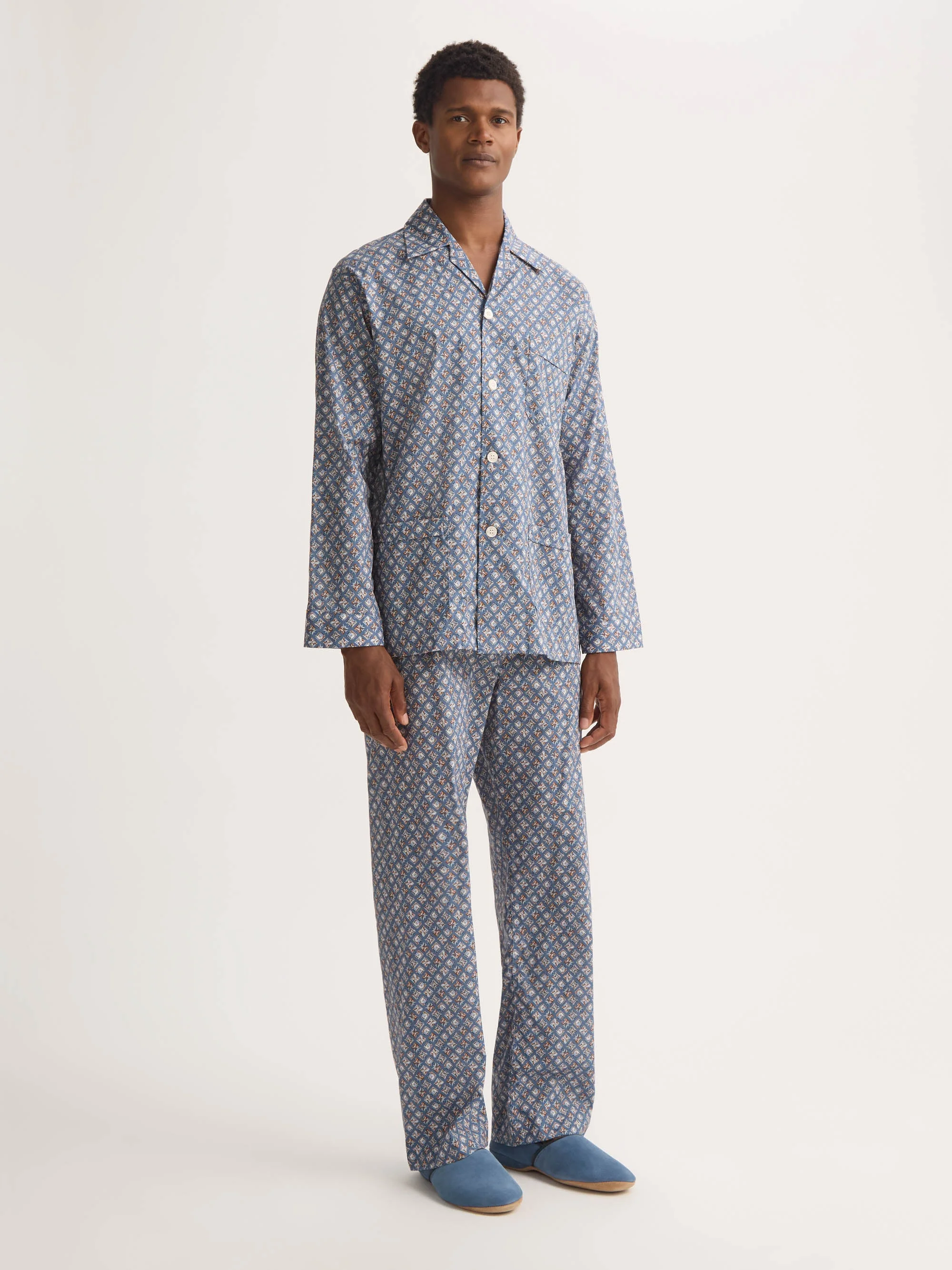 Lightweight softness with a celebratory design Featuring a celebratory geometric print inspired by faceted diamonds—symbols of life’s most important occasions—these men's pajamas bring color and character to a timeless classic. Made from lightweight cotton batiste, the fabric is soft, breathable and perfect for year-round comfort. First developed by Mr Derek Rose and refined over decades, our classic fit pajamas are designed for optimal ease. The pajama top includes a classic collar and three pockets, while the trousers feature an adjustable two-button fly. Elasticated sides ensure the front and back sit flat, delivering a smooth, relaxed fit. Light and durable, cotton batiste is a signature Derek Rose fabric, loved for its airy softness and refined feel. These pajamas combine heritage craftsmanship with a fresh, modern print. For a personal touch, add monogramming, a motif or a secret message. Model is 6’2” / 189cm, wearing a size Medium. PRODUCT DETAILS Composition: 100% Cotton Fabric Weight: Light Pattern: Print Sleeve Length: Long Sleeve Country of Origin: Czech Republic Item Number: 5000-LEDB091MUL