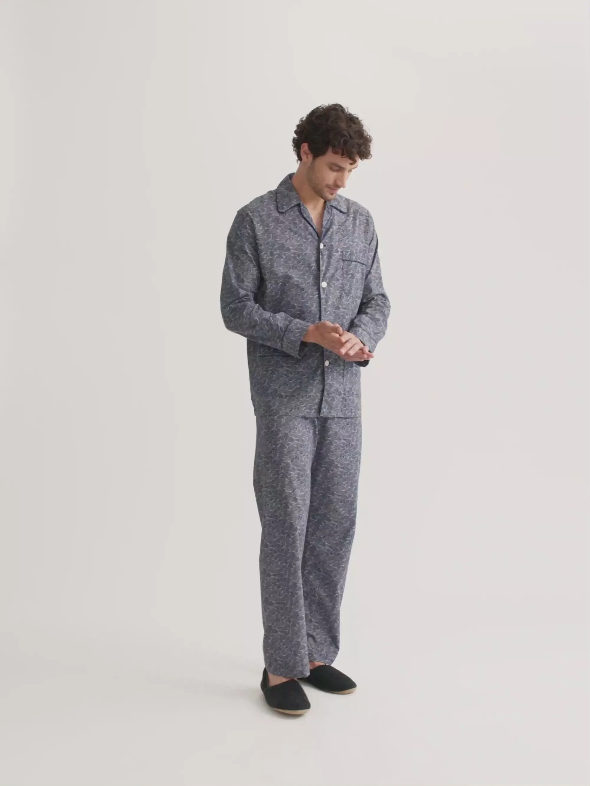 Lightweight comfort for a perfect night’s sleep Designed in ultra-fine cotton batiste, these men’s classic fit pyjamas in a navy blue Night Sky print offer the ideal balance of comfort, breathability and timeless style. Lightweight and supremely soft, they are crafted to keep you comfortable throughout the night, whatever the season. First developed by Mr Derek Rose and refined over decades, the classic fit pyjama is designed with sleep in mind. The pyjama top features a traditional collar and three-pocket design, while the trousers include an adjustable two-button fly and elasticated sides. This thoughtful construction allows the front and back to sit flat, ensuring ease of movement and uninterrupted comfort in bed. Naturally breathable and gentle against the skin, our signature cotton batiste fabric is a long-standing favourite for nightwear. Durable yet delicately soft, it is designed to be washed and worn for years to come without compromising on comfort. Add a personal touch with monogramming, a motif or a secret message—learn more about our personalisation services . Model is 6’0” / 183cm tall. He wears a size Medium. PRODUCT DETAILS Composition: 100% Cotton Fabric Weight: Light Pattern: Print Sleeve Length: Long Sleeve Country of Origin: Czech Republic Item Number: 5005-LEDB094NAV