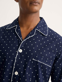 Lightweight softness with a timeless star motif. These men's pajamas feature a simple starburst motif, rotary printed on a soft cotton base for a refined yet playful finish. The navy blue design is classic and versatile, making it a stylish choice for year-round wear. Made from ultra-fine cotton batiste, the fabric is lightweight, breathable and luxuriously soft—perfect for cool, comfortable sleep in any season. Durable and easy to care for, it retains its softness and shape wash after wash. Based on a design first created by Mr Derek Rose, our classic fit pajamas have been refined for decades for ultimate comfort. The pajama top includes a classic collar and three pockets, while the pants feature an adjustable two-button waistband with open fly. Elasticated sides ensure a smooth, relaxed fit at the front and back. Add a personal touch with monogramming, a motif or a secret message. Model is 6’2” / 189cm, wearing a size Medium. PRODUCT DETAILS Composition: 100% Cotton Fabric Weight: Light Pattern: Print Sleeve Length: Long Sleeve Country of Origin: Czech Republic Item Number: 5005-NELS108NAV