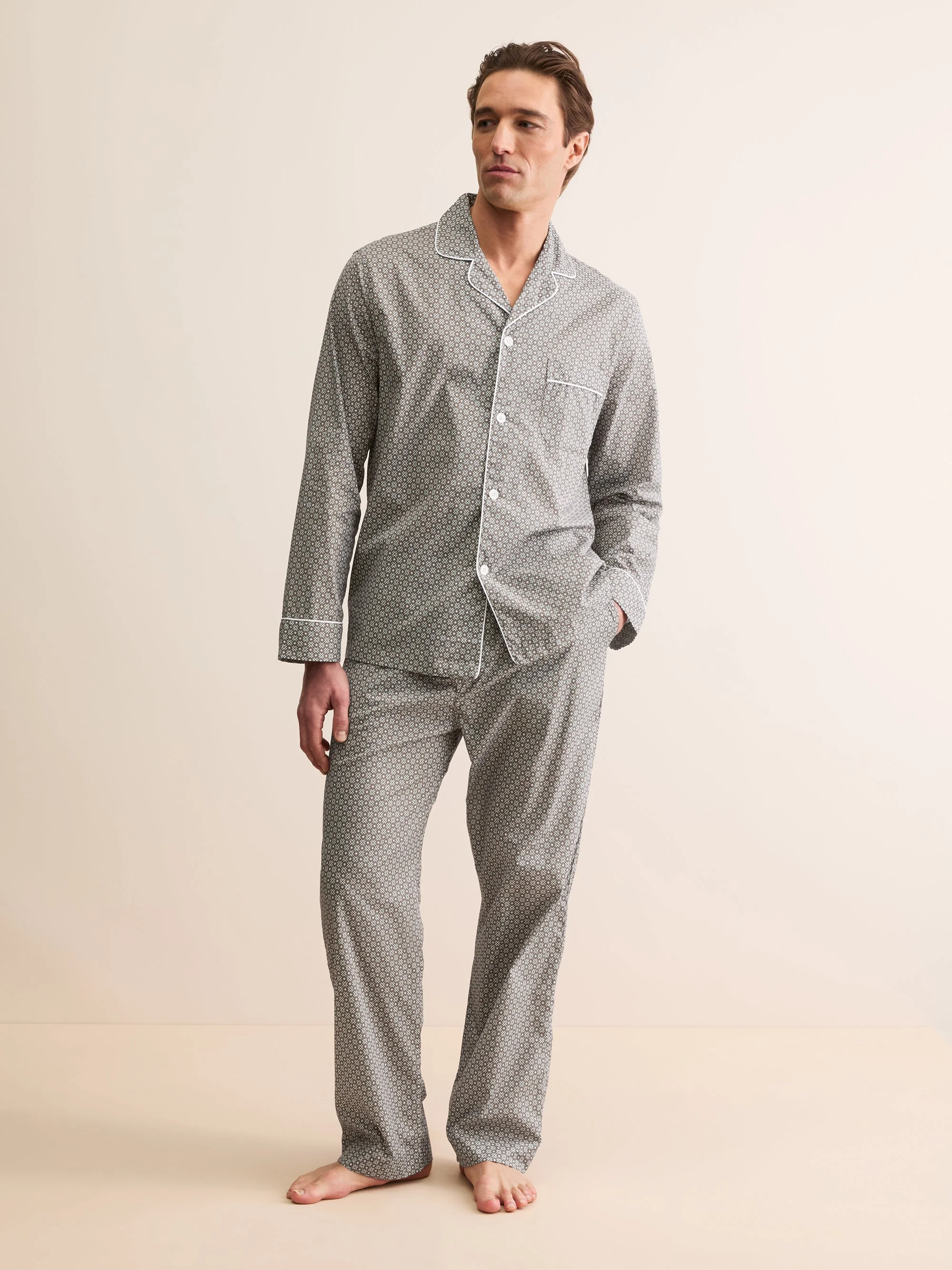 The Taupe Cross print takes inspiration from geometric patterns found across London’s transport network, reimagined in a refined seasonal brown tone. Crafted from lightweight cotton batiste for a soft, smooth and breathable feel Relaxed classic fit with an improved body and collar shape Pyjama top with contrast piping and single chest pocket for a timeless finish Trousers with side pockets and elasticated waistband for everyday comfort Magnetic fly closure for ease and practicality A refined take on a Derek Rose sleepwear classic, these cotton batiste pyjamas combine breathable comfort with modern updates. Add a personal touch by customising your chosen piece with a monogram, motif, or secret message. Model is 6’0” / 185cm, wearing a size Medium. PRODUCT DETAILS Composition: 100% Cotton Fabric Weight: Light Pattern: Print Country of Origin: Czech Republic Item Number: 5001-LEDB096BRO