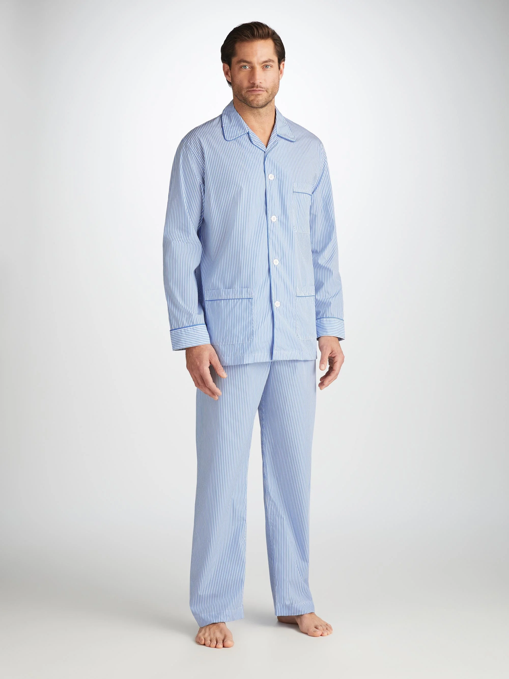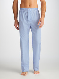 Designed for your free time with a relaxed fit, they're perfect for lounging day to night. Featuring a three pocket jacket, classic collar and adjustable two-button waistband. Elasticated sides on the trousers mean the front and back are flat for your comfort. Customise your pyjama set with your initials for a unique personalised touch. Classic and versatile. The James is a lightweight and breathable pure cotton fabric with a blue and white striped design. It's made to offer the highest level of comfort and relaxation all year round. T o make it truly special, we can personalis e your garment. We offer a range of options including monogramming, motifs, and secret messages. Read more about our personalised services here . The model is 6’1” / 188cm tall with waist size 31” / 80cm, chest size 39” / 101cm. He wears a size Medium. PRODUCT DETAILS Material: Pure Cotton Fabric Weight: Light Fabric Type: Regular Gender: Men's Colour: Light Blue Pattern: Stripe Sleeve Length: Long Sleeve Season: CLA Country of Origin: Czech Republic Composition: 100% Cotton Fit: Relaxed Fit Item Number: 5005-JAME001BLU