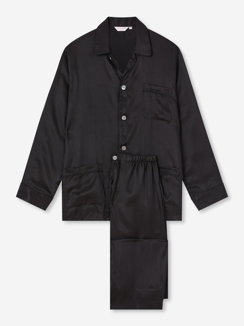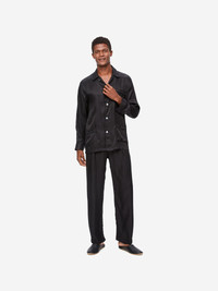 Designed for your free time with a relaxed fit, they're perfect for lounging day to night. Featuring a black pipe detailed three pocket jacket, classic collar and adjustable two-button waistband. Elasticated sides on the trousers mean the front and back are flat for your comfort. Our Woburn men's pyjamas are cut from 100% pure silk that has been woven into a satin stripe. Breathable, light and soft; they're ideal for regulating your temperature, which can keep you cool in the summer and warm in the winter. T o make it truly special, we can personalis e your garment. We offer a range of options including monogramming, motifs, and secret messages. Read more about our personalised services here . The model is 6'2" / 189cm tall. He wears a size Medium. PRODUCT DETAILS Material: Pure Silk Fabric Weight: Light Fabric Type: Satin Gender: Men's Colour: Black Pattern: Stripe Sleeve Length: Long Sleeve Season: CLA Country of Origin: Czech Republic Composition: 100% Silk Fit: Relaxed Fit Item Number: 5005-WOBU008BLA
