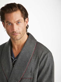 Cut by hand by our master pattern cutter and then hand-sewn and piped by our skilled seamstresses, the Duke is entirely made in our workshop in Cheshire. The Duke is crafted from the finest charcoal worsted spun cashmere, woven by Loro Piana of Italy and is fully lined in the softest of pure Italian silks. We have sourced the very best in materials and utilised our most skilled hands to make the Duke best in class. Complete the look with our Duke Cashmere Eye Mask and keep your cashmere looking it's best with our Beechwood Comb. To make it truly special, we can personalise your garment with initials or a motif. Read more about our personalised services here . If your size is out of stock, please contact our Customer Services Team as we may be able to make one for you in 1-2 weeks. The model is 6’1” / 188cm tall He wears a size Medium. PRODUCT DETAILS Material: Pure Cashmere Fabric Weight: Medium Fabric Type: Regular Gender: Men's Colour: Charcoal Pattern: Stripe Sleeve Length: Long Sleeve Season: 25-S Country of Origin: United Kingdom Composition: 100% Cashmere Fit: Regular Fit Item Number: 5516-DUKE002CHA