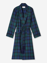 One of our best-selling dressing gowns, the tartan design showcases the colours of the Black Watch of the Royal Regiment of Scotland. Its rich, deep tones make for an elegant and timeless winter gown. It features a classic shawl collar, rifle cuffs, a breast pocket and two front pockets for practicality while around the house. Made from a medium weight grade of pure worsted wool, this is a perfect gown for keeping warm during the colder months, and it looks great over a pair of our pyjamas. We've chosen a grade of wool that is both comfortable and hard-wearing, meaning that this gown is an investment that is made to last. The model is 6'1" / 185cm tall with waist size 31” / 79cm, chest size 38” / 96cm. He wears a size Medium. Click here for our full range of Men’s Dressing Gowns. PRODUCT DETAILS Material: Pure Wool Fabric Weight: Medium Fabric Type: Regular Gender: Men's Colour: Black Pattern: Check Sleeve Length: Long Sleeve Season: CLA Country of Origin: Czech Republic Composition: 100% Wool Fit: Regular Fit Item Number: 5510-TART001BWW