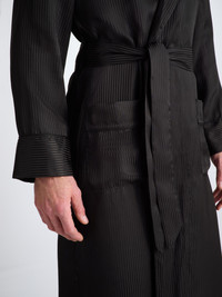One of our best-selling dressing gowns, the Woburn strikes the perfect balance between luxury and simplicity. It features a satin stripe design, a classic shawl collar with a breast pocket and two front pockets detailed with black piping for practicality while around the house. With the addition of a fabric tie waist belt for the perfect fit. Our Woburn men's dressing gown is cut from 100% pure silk that has been woven into a satin stripe. Undeniably light and soft, it will envelop you in luxurious comfort throughout the seasons. To make it truly special, we can personalise your garment with initials or a motif. Read more about our personalised services here . The model is 6'2" / 189cm tall with waist size 31.5” / 80cm, chest size 38” / 97cm. He wears a size Medium. Click here for our full range of Men’s Dressing Gowns. PRODUCT DETAILS Material: Pure Silk Fabric Weight: Light Fabric Type: Satin Gender: Men's Colour: Black Pattern: Stripe Sleeve Length: Long Sleeve Season: CLA Country of Origin: Czech Republic Composition: 100% Silk Fit: Regular Fit Item Number: 5505-WOBU008BLA