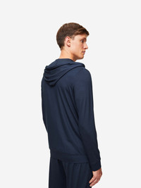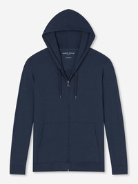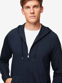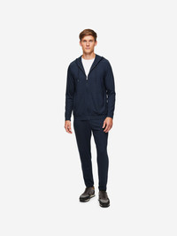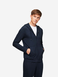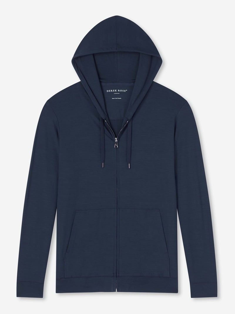 Lightweight and easy to throw on, with details such as soft cuffs and a generous drawstring hood to help retain heat. Our sophisticated take on this practical garment means that grabbing it on your way out to the shops will keep you from looking unkempt as well as keeping you warm. Not only is the Basel soft, but thermostatic properties in the micro modal fibres allow them to react to changes in temperature and regulate your body heat. The Basel fabric retains its initial softness and is also environmentally friendly; made from sustainably forested European beech trees using a process that is carbon neutral. Wash after wash the navy blue maintains its colour and the shape returns to its original design, even after being stored on a hanger for long periods. The model is 6'1" / 185cm tall with waist size 31” / 79cm, chest size 38” / 96cm. He wears a size Medium. PRODUCT DETAILS MATERIAL: Micro Modal Stretch FABRIC WEIGHT: Medium FABRIC TYPE: Jersey GENDER: Men's COLOUR: Navy PATTERN: Plain SLEEVE LENGTH: Long Sleeve SEASON: CON COUNTRY OF ORIGIN: Czech Republic COMPOSITION: 95% Modal 5% Elastane FIT: Slim Fit ITEM NUMBER: 3126-BASE001NAV