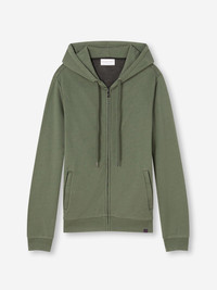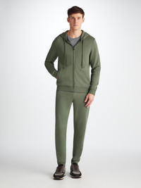 Our Quinn hoodie is stylish, yet practical. Featuring zipped front pockets with welts and with ribbed cuffs and neck trim, this hoodie is designed to hold its shape wash after wash. The Quinn fabric combines all the key qualities of our cotton and micro modal; it's durable and has great colour retention, meaning it can withstand long-lasting wear and this soft green colour won't fade. It's thermoregulating, making it perfect for warm days or cosy evenings in and it's breathable, so it's perfect for exercise. But perhaps most importantly, it's forever soft, seriously - you won't believe the quality. To make it truly special, we can personalise your garment with initials or a motif. Read more about our personalised service here. The model is 6' 1 " / 18 5 cm tall with waist size 3 1 ” / 79 cm, chest size 38 ” / 9 6 cm. He wears a size Medium . PRODUCT DETAILS Material: Cotton/Micro Modal Fabric Weight: Medium Fabric Type: Jersey Gender: Men's Colour: Soft Green Pattern: Plain Sleeve Length: Long Sleeve Season: 24-W Country of Origin: Portugal Composition: 68% Cotton 32% Modal Fit: Regular Fit Item Number: 3172-QUIN001GRE