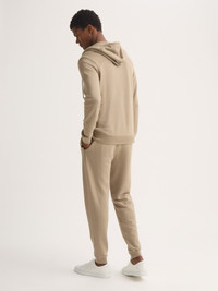 Effortless softness meets everyday performance Stylish yet practical, the Quinn Hoodie in taupe is designed for comfort that lasts. Featuring welted zipped front pockets and ribbed cuffs, hem and neck trim, this hoodie holds its shape wash after wash while offering a relaxed, modern fit. Crafted from our exclusive Quinn fabric—a luxurious blend of cotton and micro modal—it combines the breathability of natural fibres with the durability and softness of modal. The result is a fabric that’s thermoregulating, long-lasting, and exceptionally smooth against the skin. The elegant taupe shade retains its colour beautifully, even after repeated wear. Perfect for cosy evenings in, travel days or laid-back weekends, this hoodie brings together everyday versatility with premium comfort. To make it truly special, we can personalise your garment with initials or a motif. Read more about our personalised service here. Model is 6'2" / 189cm tall. He wears a size Medium. PRODUCT DETAILS Composition: 68% Cotton 32% Modal Fabric Weight: Medium Pattern: Plain Sleeve Length: Long Sleeve Country of Origin: Portugal Item Number: 3172-QUIN001BEI
