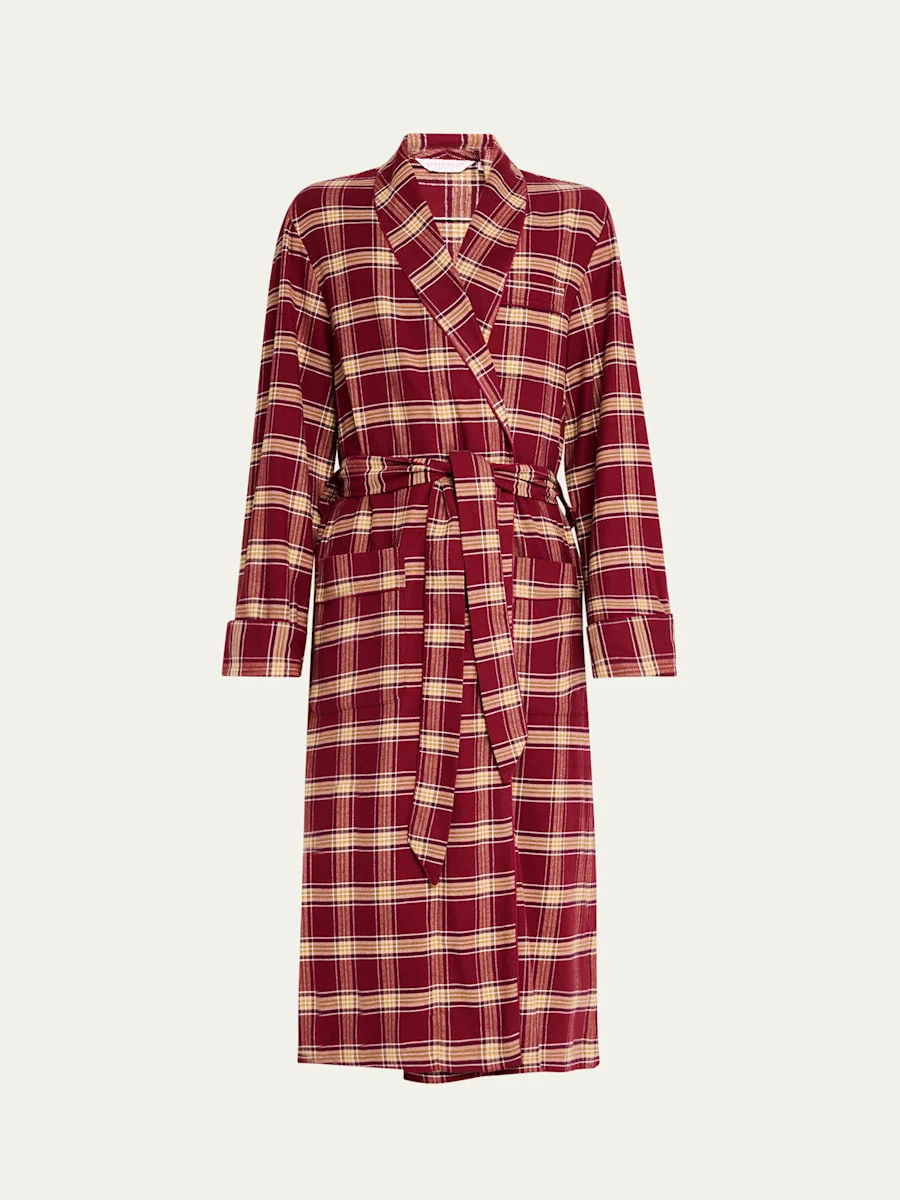 Derek Rose "Kelburn 48" robe in cotton flannel Approx. 54"L from shoulder to hem Shawl lapels Vneckline Three front patch pockets Selftie sash Long sleeves; approx. 25.0"L Relaxed fit Cotton Made in Czech Republic