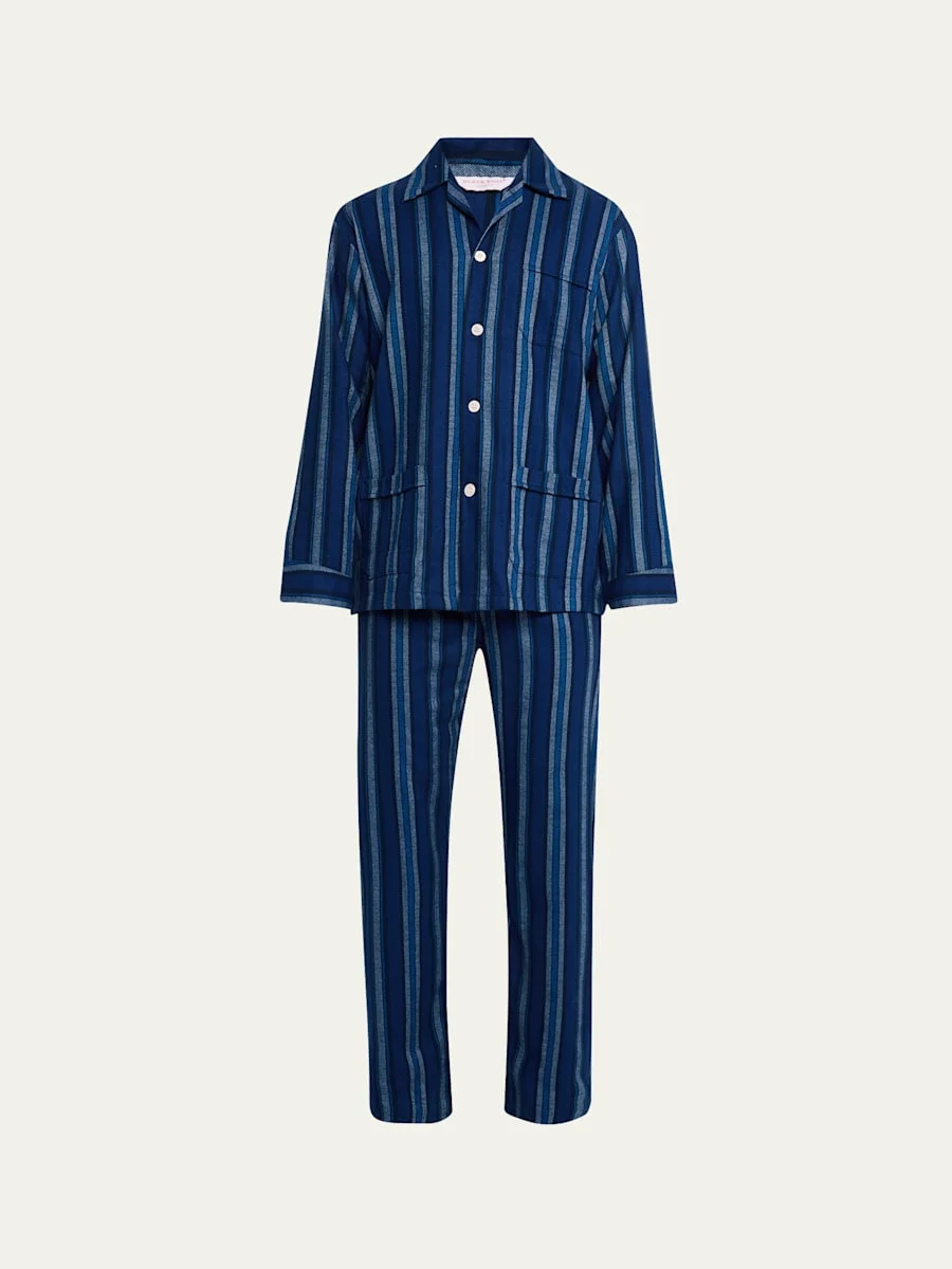 Derek Rose "Kleburn" twopiece pajama set in cotton flannel featuring a multistripe print Relaxed fit Cotton Machine wash tumble dry Made in Czech Republic Pajama shirt: Notch collar Button placket Long sleeves Three front patch pockets Pajama pants: Regular rise Relaxed legs Pullon style