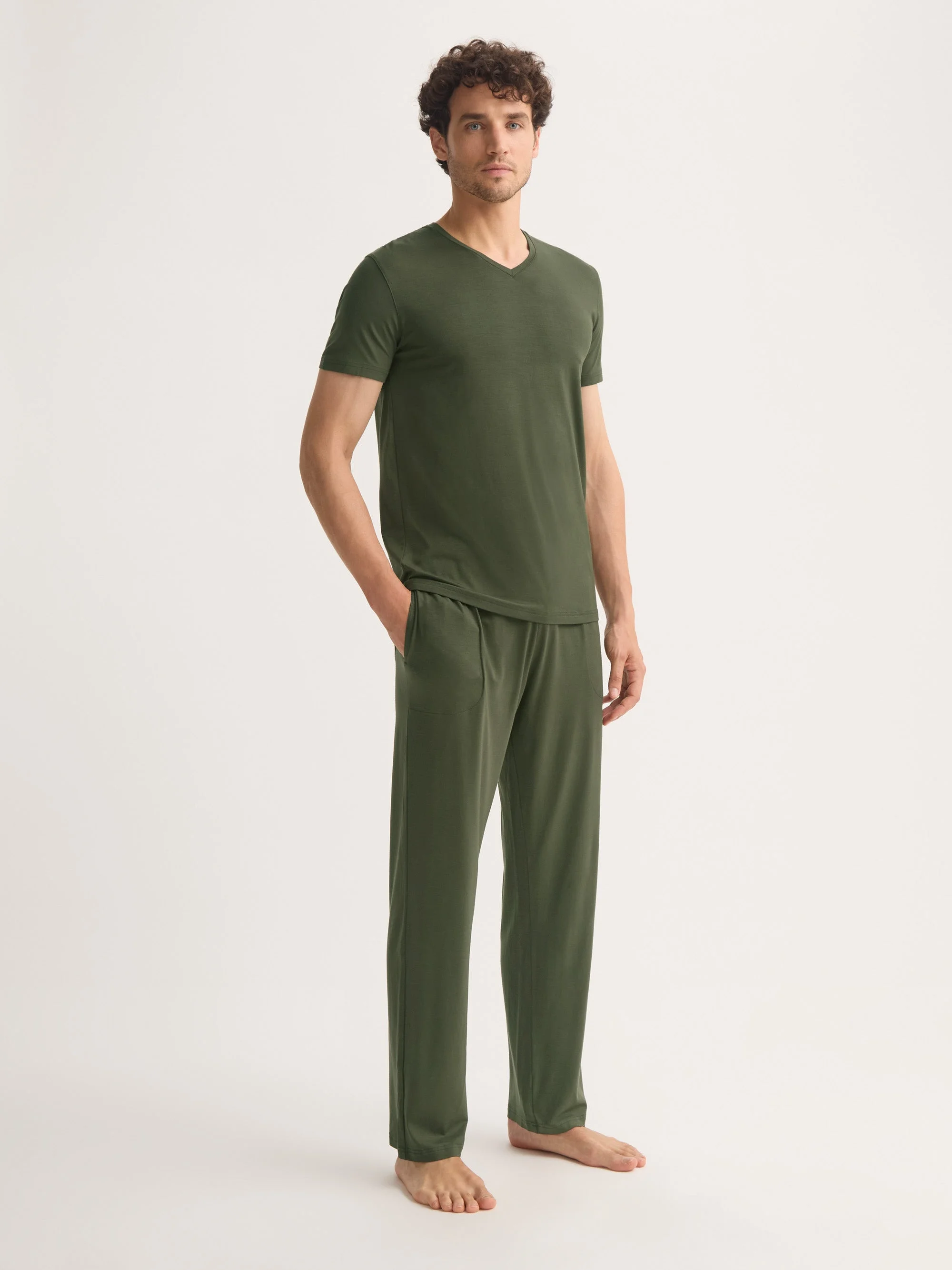 Ultra-soft comfort with a timeless fit. Crafted from our signature micro modal stretch, our men's Basel lounge pants in evergreen are designed for unmatched softness, breathability and durability. The fabric is naturally temperature-regulating, adapting to your body to keep you comfortable through every season. With a combined elastic and tie waistband, two side pockets and a back pocket, these pants balance practicality with a relaxed, flattering shape. The evergreen tone makes them a versatile addition to your loungewear wardrobe. Sustainably made from European beech trees in a carbon-neutral process, the Basel fabric resists pilling, retains its color and keeps its silky softness wash after wash. Perfect for evenings at home, weekends or travel, these pants bring understated luxury to everyday comfort. Model is 6’3” / 190cm, wearing a size Medium. PRODUCT DETAILS Composition: 95% Modal 5% Elastane Fabric Weight: Medium Pattern: Plain Country of Origin: Czech Republic Item Number: 3558-BASE022GRE