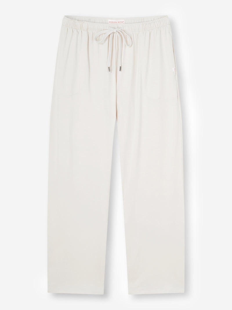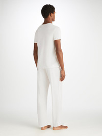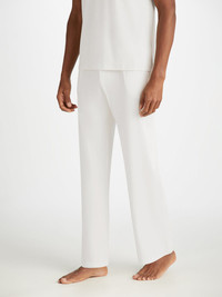 The ideal loungewear companion, the white trouser fastens with an elastic and tie waistband for a winning combination of comfort and flattering fit. The two front side pockets and a rear back pocket help to keep your phone and essentials close while you're lounging, while the black colour makes them easy to pair with our matching lounge t-shirts and hoodies. Our Basel fabric has to be touched to be believed. It offers long-lasting softness and doesn't pill, making it able to withstand countless days of lounging. The micro modal fabric constantly reacts to your body and helps you stay cool or warm according to your temperature. Clever. Furthermore, this special fabric is also environmentally friendly; made from sustainably forested European beech trees. The durability and quality of it also means you’ll be wearing your trousers for years to come! The model is 6'2" / 189cm tall with waist size 31.5” / 80cm, chest size 38” / 97cm. He wears a size Medium . PRODUCT DETAILS Material: Micro Modal Stretch Fabric Weight: Medium Fabric Type: Jersey Gender: Men's Colour: White Pattern: Plain Season: CUST Country of Origin: Czech Republic Composition: 95% Modal 5% Elastane Fit: Regular Fit Item Number: 3558-BASE001WHI