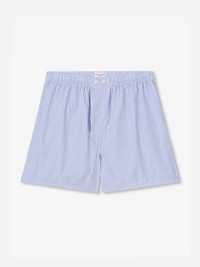 Designed for a more generous fit, our classic fit boxer shorts feature a back panel to avoid the uncomfortable rear centre seam; ideal for those who prefer more coverage and a relaxed shape. The waistband is also fully elasticated and can be adjusted using the traditional two-button fly. Classic and versatile. The James is a lightweight and breathable pure cotton fabric with a blue and white striped design. It's made to offer the highest level of comfort and relaxation all year round. The model is 6'1" / 186cm tall with waist size 32” / 81cm, chest size 40” / 100cm. He wears a size Medium. PRODUCT DETAILS Material: Pure Cotton Fabric Weight: Light Fabric Type: Regular Gender: Men's Colour: Light Blue Pattern: Stripe Season: CLA Country of Origin: Czech Republic Composition: 100% Cotton Fit: Regular Fit Item Number: 6000-JAME001BLU