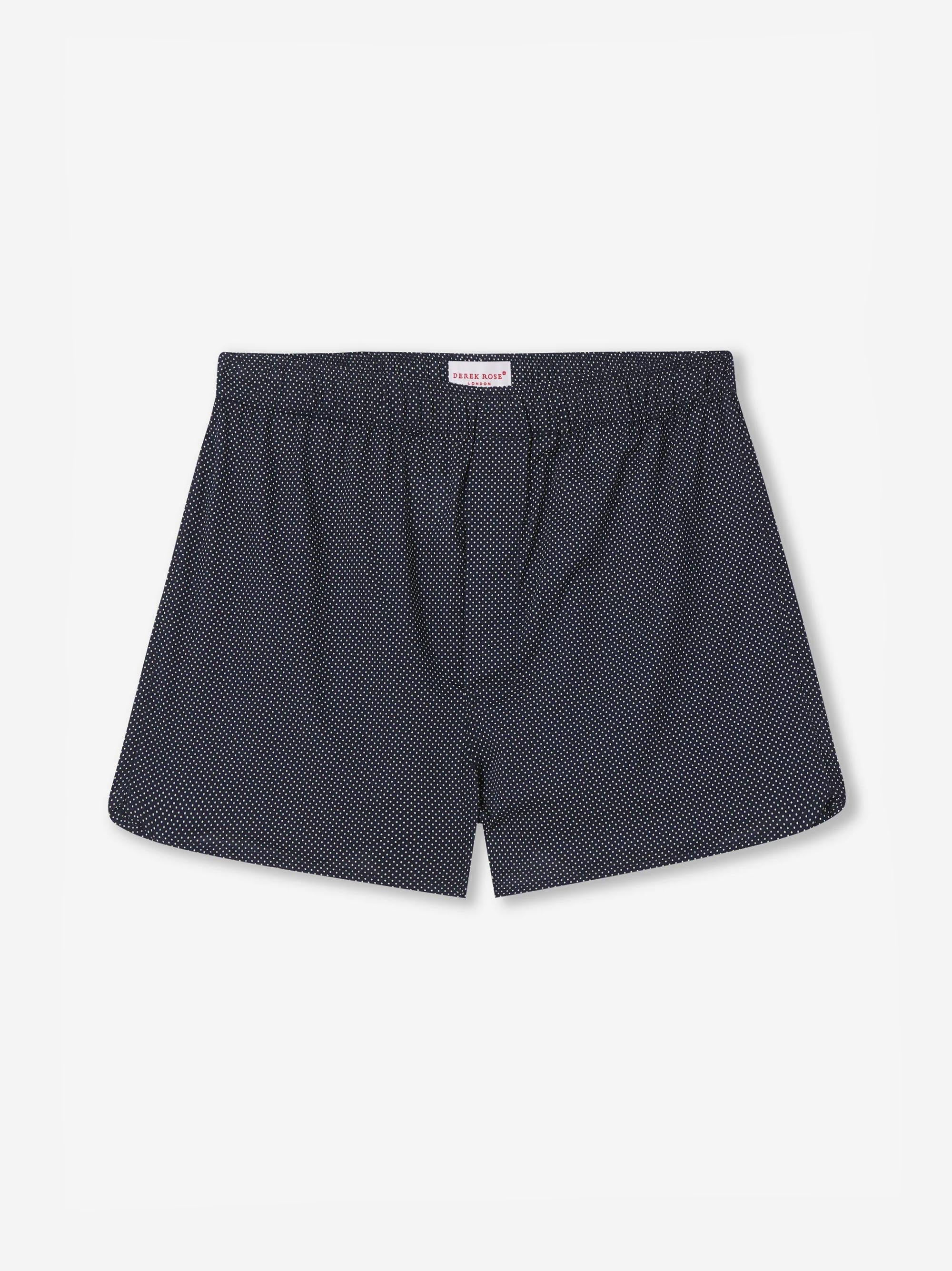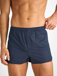 Our modern fit boxers feature a streamlined shape for a flattering design that remains comfortable. An elasticated waistband, curved leg seams and side vents ensure longevity and practicality, whilst our self-seeking magnetic fly closure is a hidden blessing. This simple but revolutionary feature allows easy opening and hassle-free closure of the fly. The Plaza 21 boxers are woven from our extra lightweight, super-soft and breathable pure cotton batiste, with a printed navy and white spot motif finish. They're the perfect choice for keeping you cool and comfortable throughout the seasons. The model is 6'2" / 189cm tall with waist size 31.9” / 81cm, chest size 37.8” / 96cm. He wears a size Medium. PRODUCT DETAILS Material: Pure Cotton Fabric Weight: Light Fabric Type: Regular Gender: Men's Colour: Navy Pattern: Print Season: CLA Country of Origin: Czech Republic Composition: 100% Cotton Fit: Regular Fit Item Number: 6050-PLAZ021NAV