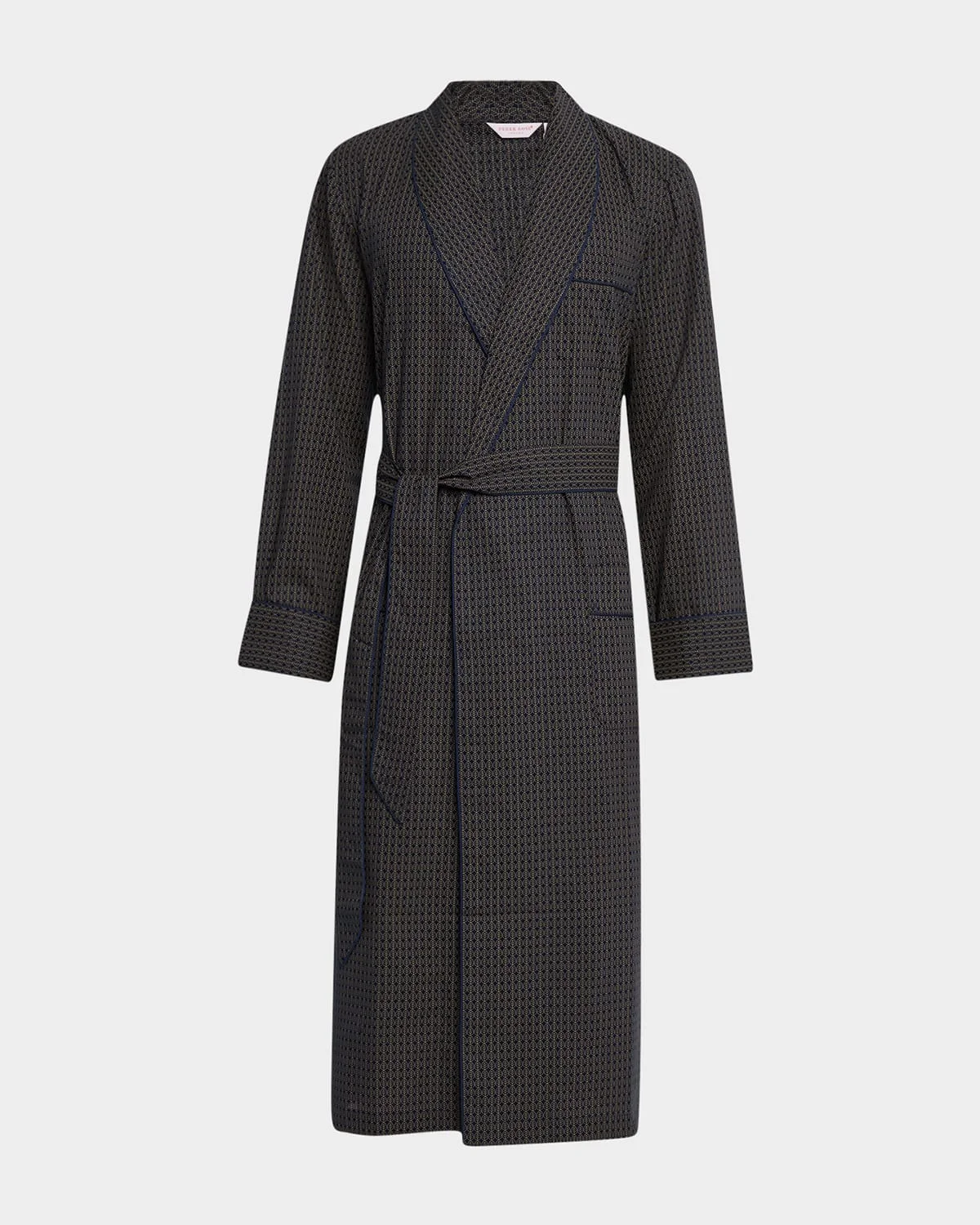 - Derek Rose "Nelson" bath robe in cotton showcasing a mini leaf print with contrastring trim - Approx. 52"L from shoulder to hem - Features a breast pocket and two front pockets for practicality while around the house - V-neckline - Shawl collar - Long sleeves; approx. 25.5"L - Self-tie waist sash - Relaxed fit - Cotton - Machine wash - Made in Czech Republic