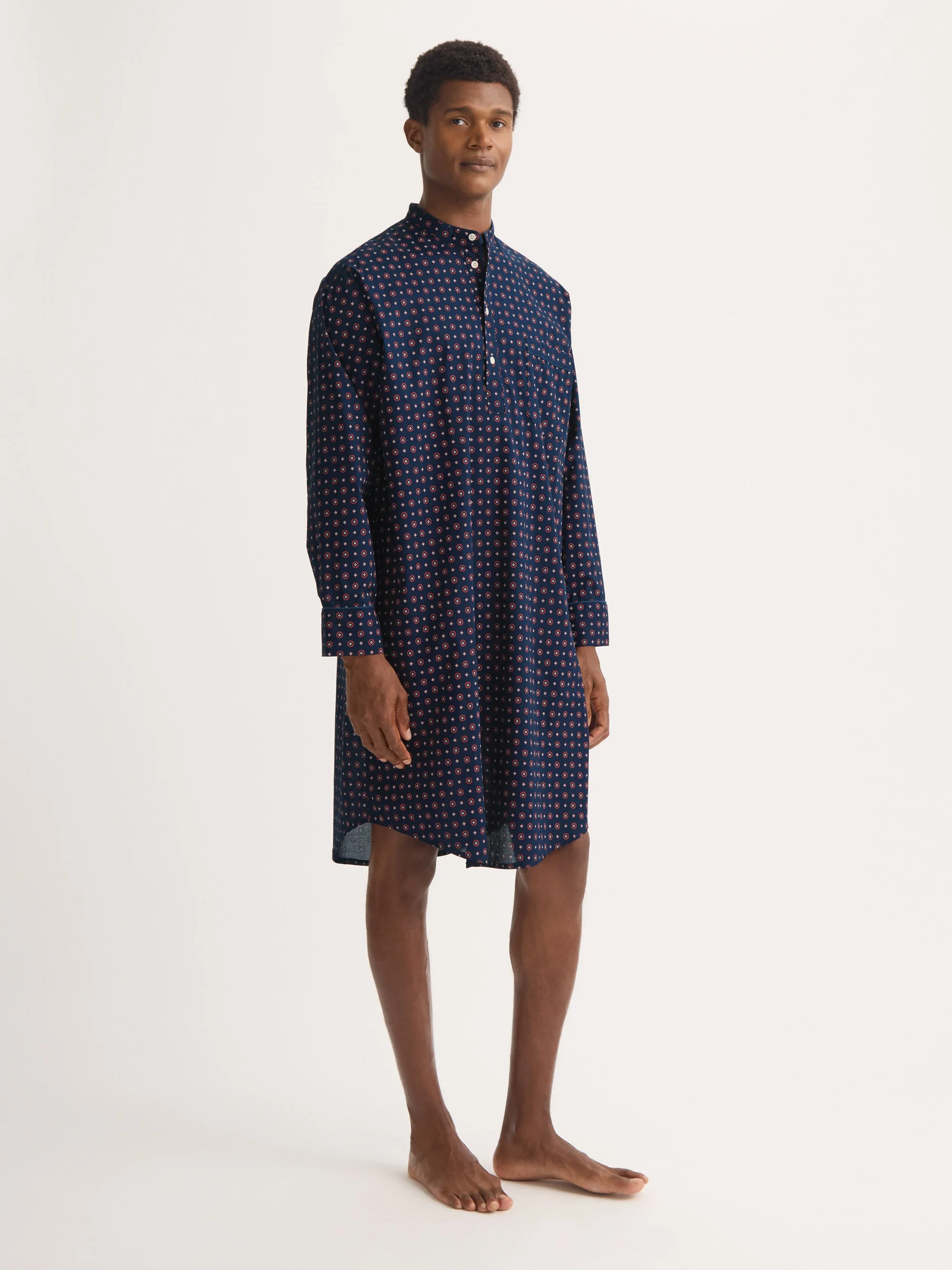 Lightweight heritage style with a refined rose motif. Celebrating 100 years of Derek Rose, this nightshirt features a hand-drawn foulard design with a subtle rose motif, coloured in timeless navy blue. Crafted from our signature lightweight cotton batiste, it offers a supremely soft, breathable and cool feel—perfect for a restful night’s sleep. Cut generously for ease of movement, the nightshirt includes a four-button pullover front, neckband collar and breast pocket. A piped finish at the cuffs, pocket and collar adds an elegant touch to this classic sleepwear style. Durable, airy and effortlessly comfortable, this nightshirt combines traditional design with modern craftsmanship. Add a personal touch with monogramming or a motif—learn more about our personalisation services. Model is 6’2” / 189cm, wearing a size Medium. PRODUCT DETAILS Composition: 100% Cotton Fabric Weight: Light Pattern: Print Sleeve Length: Long Sleeve Country of Origin: Czech Republic Item Number: 5775-NELS107NAV