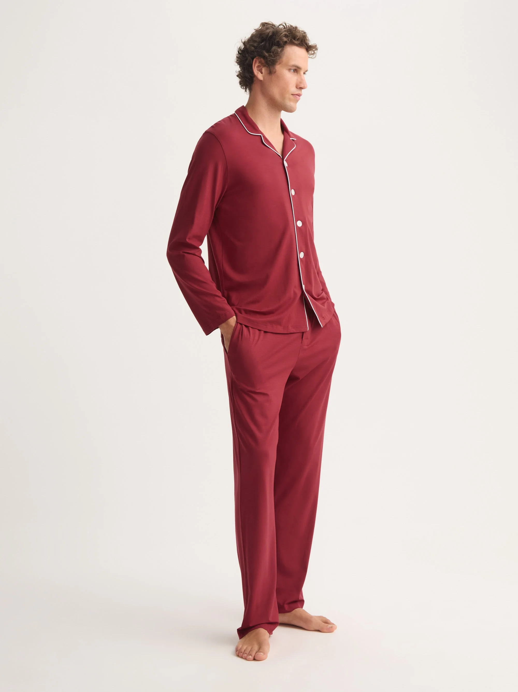Luxury Comfort in Timeless Rustic Red Crafted from our signature micro modal stretch, the men's Basel pajamas are designed for supreme softness, breathability and year-round comfort. Naturally temperature-regulating, the fabric adapts to your body to keep you cool or warm as needed. The pajama top is finished with white piping, a flat open collar and imitation mother-of-pearl buttons, while the trousers feature our patented self-seeking magnetic fly closure for effortless practicality. Cut in a classic fit, this set is as refined as it is comfortable. The Basel fabric is sustainably crafted from European beech trees using a carbon-neutral process. Durable, color-fast and resistant to pilling, it retains its luxurious softness and rich rustic red tone wash after wash. Perfect for evening relaxation, travel, or elevating your nightly routine, these pajamas redefine modern loungewear. Add a personal touch by customizing your chosen piece with a monogram, motif or secret message. Model is 6'3" / 190 cm, wearing a size Medium. PRODUCT DETAILS Composition: 95% Modal 5% Elastane Fabric Weight: Medium Pattern: Plain Sleeve Length: Long Sleeve Country of Origin: Czech Republic Item Number: 4070-BASE022RED