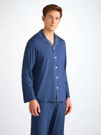 Wash after wash the Basel sapphire blue maintains its colour and the shape returns to its original design, even if left on a hanger for a long period. Not only are the Basel pyjamas soft, but thermostatic properties in the micro modal fibres allow them to react to changes in temperature and regulate your body heat. Furthermore, the Basel fabric retains its initial softness and is also environmentally friendly; made from sustainably forested European beech trees using a process that is carbon neutral. The Basel trousers also feature our self-seeking magnetic fly closure. A hidden blessing to every man, this simple but revolutionary feature allows easy opening and hassle-free closure of the fly. To finish the refined look, the jacket has white piping, a flat and open collar and mother of pearl buttons throughout. To make it truly special, we can personalise your garment with initials or a motif. Read more about our personalised service here . The model is 6'1" / 185cm tall. He wears a size Medium. PRODUCT DETAILS Composition: 95% Modal 5% Elastane Fabric Weight: Medium Pattern: Plain Sleeve Length: Long Sleeve Country of Origin: Czech Republic Item Number: 4070-BASE020BLU