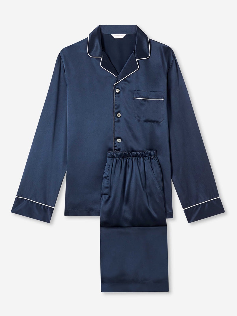 Handmade in our workshop in Cheshire, England, the Bailey silk pyjama is cut by hand to ensure a supremely soft and elegant satin finish. Produced in extremely limited quantities and the result of hours of loving craftwork by our skilled pattern cutters and seamstresses, you're sure to feel like royalty while lounging at home in our comfortable and beautiful silk sleepwear. The Derek Rose silk pyjama is made to a specification first developed by Mr Derek Rose decades ago and refined over the years. Features include a revere collar and chest pocket on the jacket, hidden magnetic fly, and an elasticated waistband on the trousers for ultimate comfort. Crafted from our signature satin smooth navy silk - the Bailey fabric has been a customer favourite and a Derek Rose staple for many years due to its elegant and comfortable nature. The model is 6'1" / 185cm tall with waist size 31” / 79cm, chest size 38” / 96cm. He wears a size Medium. PRODUCT DETAILS MATERIAL: Pure Silk FABRIC WEIGHT: Light FABRIC TYPE: Regular GENDER: Men's COLOUR: Navy PATTERN: Plain SLEEVE LENGTH: Long Sleeve SEASON: CON COUNTRY OF ORIGIN: United Kingdom COMPOSITION: 100% Silk FIT: Regular Fit ITEM NUMBER: 5085-BAIL001NAV