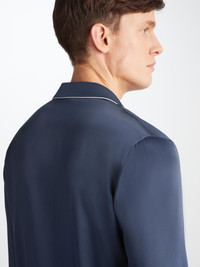 Handmade in our workshop in Cheshire, England, the Bailey silk pyjama is cut by hand to ensure a supremely soft and elegant satin finish. Produced in extremely limited quantities and the result of hours of loving craftwork by our skilled pattern cutters and seamstresses, you're sure to feel like royalty while lounging at home in our comfortable and beautiful silk sleepwear. The Derek Rose silk pyjama is made to a specification first developed by Mr Derek Rose decades ago and refined over the years. Features include a revere collar and chest pocket on the jacket, hidden magnetic fly, and an elasticated waistband on the trousers for ultimate comfort. Crafted from our signature satin smooth navy silk - the Bailey fabric has been a customer favourite and a Derek Rose staple for many years due to its elegant and comfortable nature. T o make it truly special, we can personalis e your garment. We offer a range of options including monogramming, motifs, and secret messages. Read more about our personalised services here . If your size is out of stock, please contact our Customer Services Team , we can make one for you in 1-2 weeks. The model is 6'1" / 185cm tall with waist size 31” / 79cm, chest size 38” / 96cm. He wears a size Medium. PRODUCT DETAILS Material: Pure Silk Fabric Weight: Light Fabric Type: Regular Gender: Men's Colour: Navy Pattern: Plain Sleeve Length: Long Sleeve Season: 24-W Country of Origin: United Kingdom Composition: 100% Silk Fit: Regular Fit Item Number: 5085-BAIL001NAV