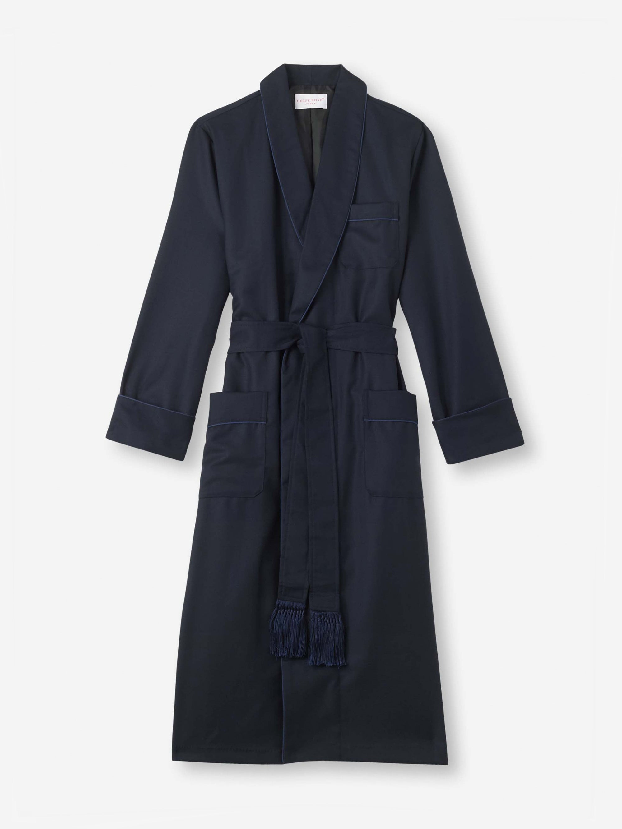 A home wardrobe staple, our Westminster gown features a classic shawl collar, navy piping, a breast pocket and two front pockets for practicality while around the house. It's fastened with a tasselled belt for the perfect fit and finished with internal ties and fully lined inside. Made from fine grade worsted wool, this dressing gown ensures warmth, comfort and durability without being heavy or bulky. A must-have for the colder months, it looks great over our classic Basel t-shirt or combined with a pair of our pyjamas for the ultimate cosy lounging look. To make it truly special, we can personalise your garment with initials or a motif. Read more about our personalised services here . The model is 6'1" / 185cm tall. He wears a size Medium. PRODUCT DETAILS Material: Pure Wool Fabric Weight: Medium Fabric Type: Regular Gender: Men's Colour: Navy Pattern: Plain Sleeve Length: Long Sleeve Season: 26-S Country of Origin: Czech Republic Composition: 100% Wool Fit: Regular Fit Item Number: 5901-WEST002NAV