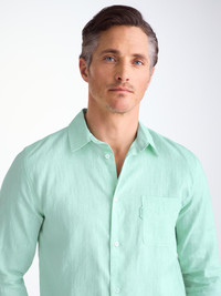 The Monaco shirt in mint green features a curved back yoke with a box-pleat for comfort and a curved hem with side vents for ease of movement. We've used the classic styling of a button-through front and cuffs, a 2-piece collar and for a modern addition, we've added a U-shaped breast pocket with a handy sunglass loop for effortless summer chic. For a final touch of luxe, the shirt is finished with mother of pearl buttons throughout and our minimalist rose logo label at the hem. There's also a handy 'locker' loop on the back for you to hang your shirt up when changing. We have developed this Italian fabric to be a lightweight, beautifully soft and breathable pure linen that will keep you cool and comfortable in even the hottest of conditions. This men's shirt is designed for a regular fit. The model is 6’2’’ / 188.5cm tall. He wears a size Medium. PRODUCT DETAILS Material: Pure Linen Fabric Weight: Light Fabric Type: Regular Gender: Men's Colour: Mint Green Pattern: Plain Sleeve Length: Long Sleeve Season: 26-S Country of Origin: Czech Republic Composition: 100% Linen Fit: Regular Fit Item Number: 9820-MONA001GRE