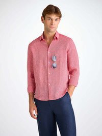 The Monaco shirt in red features a curved back yoke with a box-pleat for comfort and a curved hem with side vents for ease of movement. We've used the classic styling of a button-through front and cuffs, a 2-piece collar and for a modern addition, we've added a U-shaped breast pocket with a handy sunglass loop for effortless summer chic. For a final touch of luxe, the shirt is finished with mother of pearl buttons throughout and our minimalist rose logo label at the hem. There's also a handy 'locker' loop on the back for you to hang your shirt up when changing. We have developed this Italian fabric to be a lightweight, beautifully soft and breathable pure linen that will keep you cool and comfortable in even the hottest of conditions. This men's shirt is designed for a regular fit. The model is 6’2’’ / 188.5cm tall. He wears a size Medium. PRODUCT DETAILS Material: Pure Linen Fabric Weight: Light Fabric Type: Regular Gender: Men's Colour: Red Pattern: Plain Sleeve Length: Long Sleeve Season: 25-W Country of Origin: Czech Republic Composition: 100% Linen Fit: Regular Fit Item Number: 9820-MONA001RED