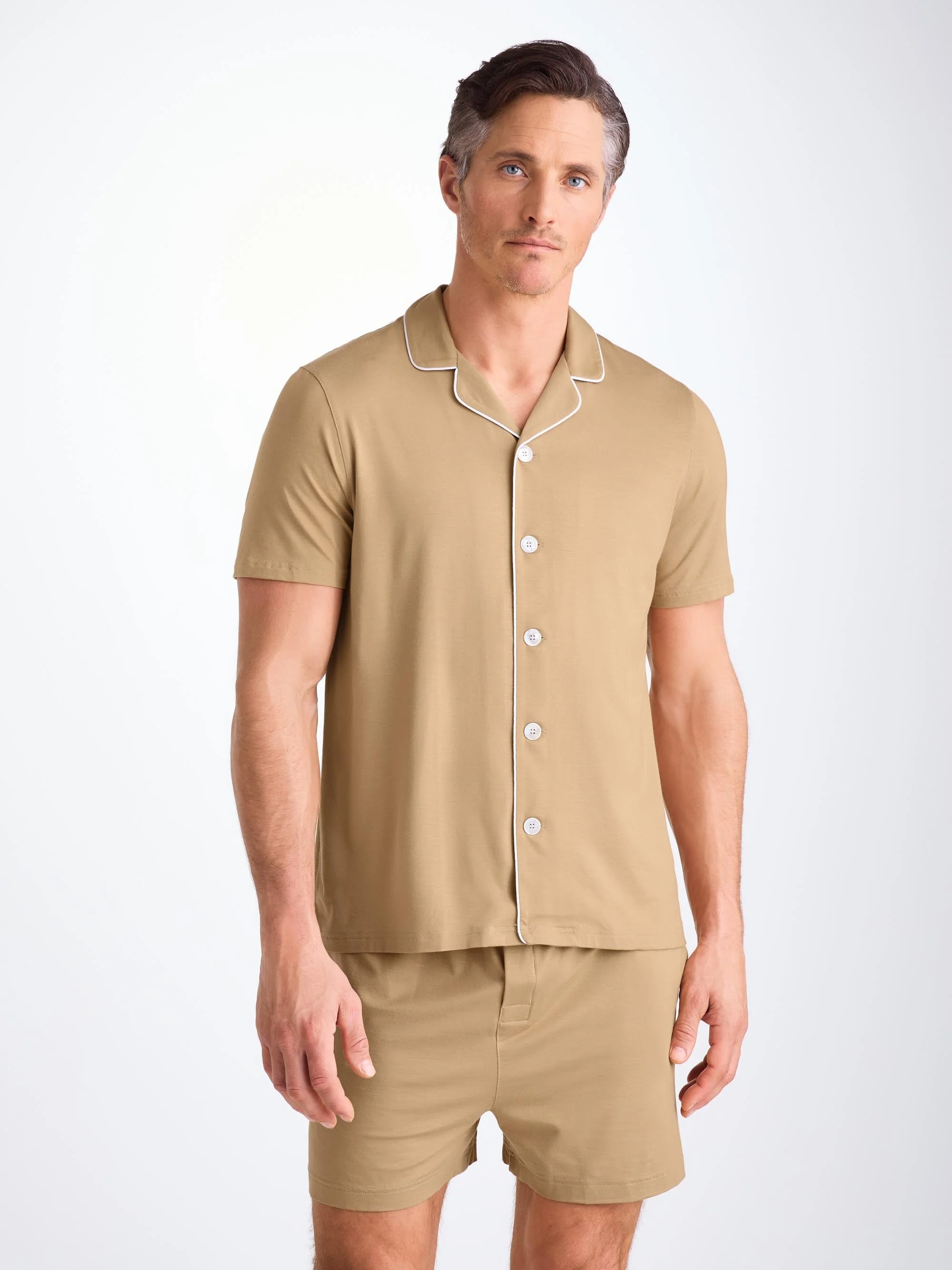 Wash after wash the camel fabric maintains its colour and the shape returns to its original design, even if left on a hanger for a long period. Not only are the Basel pyjamas soft, but thermostatic properties in the micro modal fibres allow them to react to changes in temperature and regulate your body heat. Furthermore, the Basel fabric retains its initial softness and is also environmentally friendly; made from sustainably forested European beech trees using a process that is carbon neutral. The Basel shorts also feature our self-seeking magnetic fly closure. A hidden blessing to every man, this simple but revolutionary feature allows easy opening and hassle-free closure of the fly. To finish the refined look, the jacket has white piping, a flat and open collar and mother of pearl buttons throughout. The model is 6’2’’ / 188.5cm tall. He wears a size Medium. PRODUCT DETAILS Material: Micro Modal Stretch Fabric Weight: Medium Fabric Type: Jersey Gender: Men's Colour: Camel Pattern: Plain Sleeve Length: Short Sleeve Season: 25-W Country of Origin: Czech Republic Composition: 95% Modal 5% Elastane Fit: Regular Fit Item Number: 4090-BASE020CAM