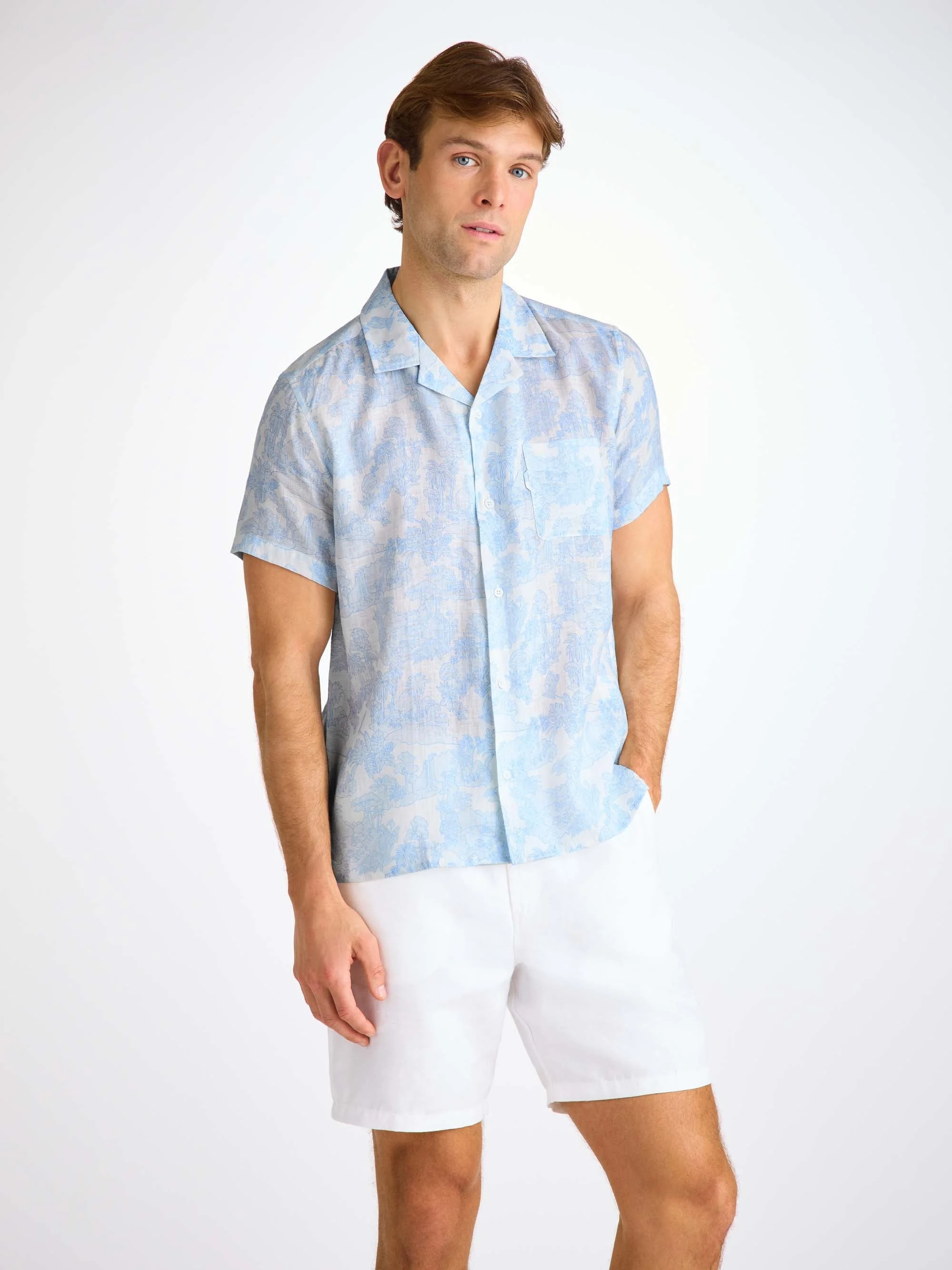 The Milan 26 shirt combines details like a curved back yoke with a box-pleat, made for comfort with a curved hem with side vents for ease of movement. Our hand drawn island hopping print in white and blue is a modern interpretation of a toile de Jouy. Filled with tropical trees and plan life, it features a tropical bird flying in-between the islands. We've used the classic styling of a button-through front and cuffs, a 2-piece collar and for a modern addition, we've added a U-shaped breast pocket with a handy sunglass loop for effortless summer chic. We have developed a lightweight, beautifully soft and breathable pure linen that will keep you cool and comfortable in even the hottest of conditions. Made in Italy, this fabric is dyed at the yarn stage for an eventual two-tone melange effect when the threads are combined together. The model is 6’2’’ / 188.5cm tall. He wears a size Medium. PRODUCT DETAILS Material: Pure Linen Fabric Weight: Light Fabric Type: Regular Gender: Men's Colour: White Pattern: Print Sleeve Length: Short Sleeve Season: 25-W Country of Origin: Czech Republic Composition: 100% Linen Fit: Regular Fit Item Number: 9825-MILA026WHI