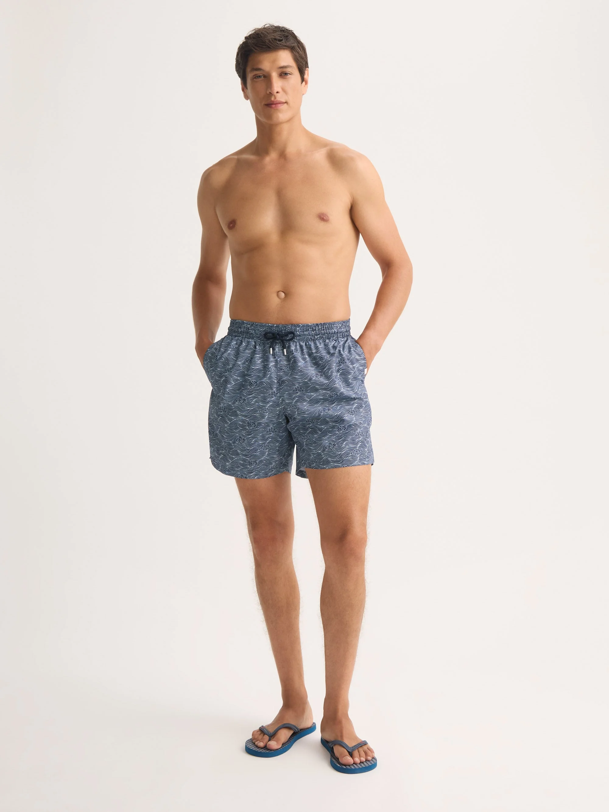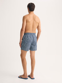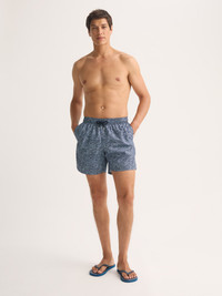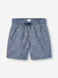 Celestial design meets relaxed swimwear style. The men's Maui swim shorts feature a flowing linear print inspired by the night sky, with stylised clouds drifting across a deep navy background. Refined and versatile, they bring a touch of artistry to a swimwear essential. Designed for a relaxed fit, these swim shorts include a fully elasticated waistband with braided drawstring ties, finished with metal aglets for a luxe detail. Cotton-stitched eyelets at the back allow for easy air and water drainage, while the seamless mesh lining ensures superior comfort. Made from quick-drying polyamide pre-washed for a soft feel, they’re as comfortable on land as in water. A mesh-lined back pocket with a pin-lock zip keeps valuables secure, neatly finished with a welt. Each pair comes with a dry bag—perfect for carrying essentials or storing wet shorts after swimming. Effortlessly combining design and function, the Maui is ideal for poolside lounging or seaside escapes. Model is 6’0” / 183cm, wearing a size Medium. PRODUCT DETAILS Composition: 100% Polyester Fabric Weight: Medium Pattern: Print Country of Origin: Portugal Item Number: 9761-MAUI078NAV