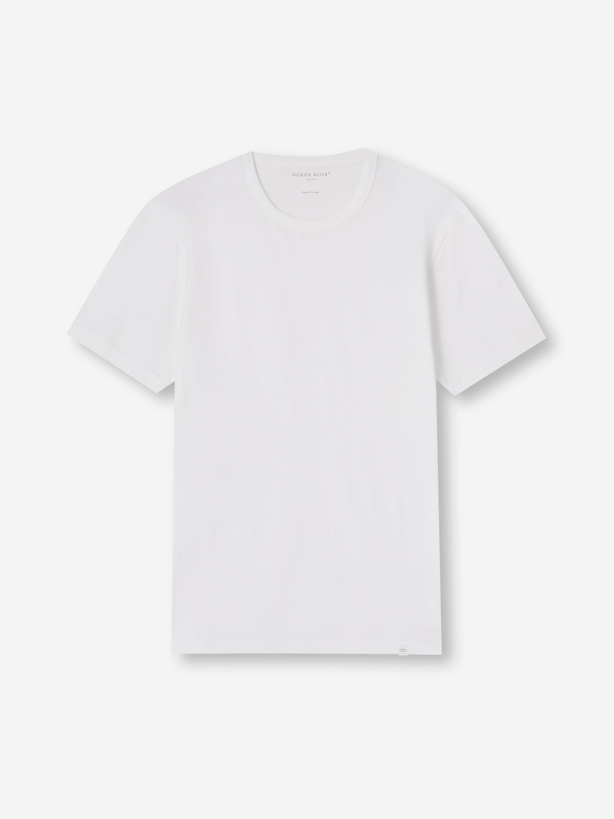 Designed in a fabric exclusive to Derek Rose, Barny is our brand new everyday wear t-shirt. Knitted in the EU, our mid weight Pima cotton t-shirt is not only breathable, but hypoallergenic. An excellent choice for any occasion. Created in a casual relaxed fit, the crew neckline features a bound collar with detailed ribbing. We have chosen to print our label inside of the neckline for optimal comfort. With twin needle cuffs and hem, our Barny t-shirt, seen here in white, is made for every adventure due to its durable finish. Pair with your trousers or shorts of choice for a capsule wardrobe essential. To make it truly special, we can personalise your garment with initials or a motif. Read more about our personalised service here . The model is 6’1” / 188cm tall with waist size 31” / 80cm, chest size 39” / 101cm. He wears a size Medium. PRODUCT DETAILS Material: Pure Cotton Fabric Weight: Medium Fabric Type: Jersey Gender: Men's Colour: White Pattern: Plain Sleeve Length: Short Sleeve Season: 24-W Neck Shape: Crew Neck Country of Origin: Portugal Composition: 100% Cotton Fit: Regular Fit Item Number: 3175-BARN002WHI