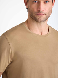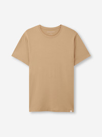Our signature Basel men’s t-shirt in camel is a wardrobe essential: versatile and classic. Made from a unique blend of stretch micro modal for an extraordinarily soft and comfortable wear, it will quickly become your go-to t-shirt. Perfect for sleeping, lounging or making a long-haul flight a lot more bearable. Featuring a soft crew-neck band finish and a streamlined shape that is both comfortable and flattering, we've elevated this loungewear t-shirt into a luxury essential. One of our signature fabrics and a customer favourite, our breathable Basel t-shirt is perfect indoors or outside. The micro modal fabric constantly reacts to your body and helps you stay cool or warm according to your temperature. Clever. Furthermore, this special fabric is also environmentally friendly; made from sustainably forested European beech trees. The durability and quality of it also means you’ll be wearing your t-shirt for years to come! To make it truly special, we can personalise your garment with initials or a motif. Read more about our personalised services here . The model is 6’1” / 188cm tall. He wears a size Medium. PRODUCT DETAILS Material: Micro Modal Stretch Fabric Weight: Medium Fabric Type: Jersey Gender: Men's Colour: Camel Pattern: Plain Sleeve Length: Short Sleeve Season: 25-W Neck Shape: Crew Neck Country of Origin: Czech Republic Composition: 95% Modal 5% Elastane Fit: Regular Fit Item Number: 3048-BASE020CAM