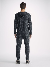 Our London 11 jersey track pants feature an all-over black loveheart camo print for a luxurious twist on classic jersey. Made from our specially developed Basel fabric, a unique blend of micro modal stretch, the London 11 is ultra-soft and doesn't pill, making it able to withstand countless days of lounging, numerous sessions at the gym and even a casual weekend day out. Not only is the London soft, but thermostatic properties in the micro modal fibres allow them to react to changes in temperature and regulate your body heat. What's more, the fabric retains its initial softness and is also environmentally friendly; made from sustainably forested European beech trees using a process that is carbon neutral. Featuring a combined elastic and tie waistband for ultimate comfort, two front side pockets with concealed pin-lock zips for a clean finish and cuffed bottoms for a modern touch. The flattering fit and classic black colour will stand the test of time. The model is 6’0”/ 183cm tall with waist size 32.5”/ 82cm, chest size 40”/ 101.5cm. He wears a size Medium. PRODUCT DETAILS Material: Micro Modal Stretch Fabric Weight: Medium Fabric Type: Jersey Gender: Men's Colour: Black Pattern: Print Season: 24-S Country of Origin: Czech Republic Composition: 95% Modal 5% Elastane Fit: Regular Fit Item Number: 9403-LOND011BLA