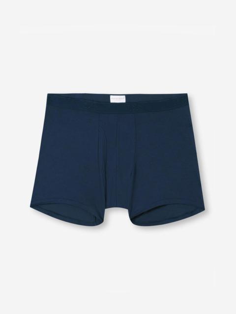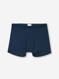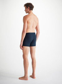 Our navy Alex trunks are cut for a streamlined, classic look with a fitted shape, classic open front and a longer leg. A fabric-covered waistband provides gentle skin contact. Crafted from a lighter weight version of our best-selling Basel fabric, combining a blend of 94% micro modal and 6% elastane for exceptional softness and comfort. Not only is the Alex soft, but thermostatic properties in the micro modal fibres allow them to react to changes in temperature and regulate your body heat. What's more, the fabric is also environmentally friendly. The model is 6’1” / 188cm tall. He wears a size Medium. PRODUCT DETAILS Material: Micro Modal Stretch Fabric Weight: Light Fabric Type: Jersey Gender: Men's Colour: Navy Pattern: Plain Season: 25-W Country of Origin: Portugal Composition: 94% Modal 6% Elastane Fit: Regular Fit Item Number: 8547-ALEX001NAV