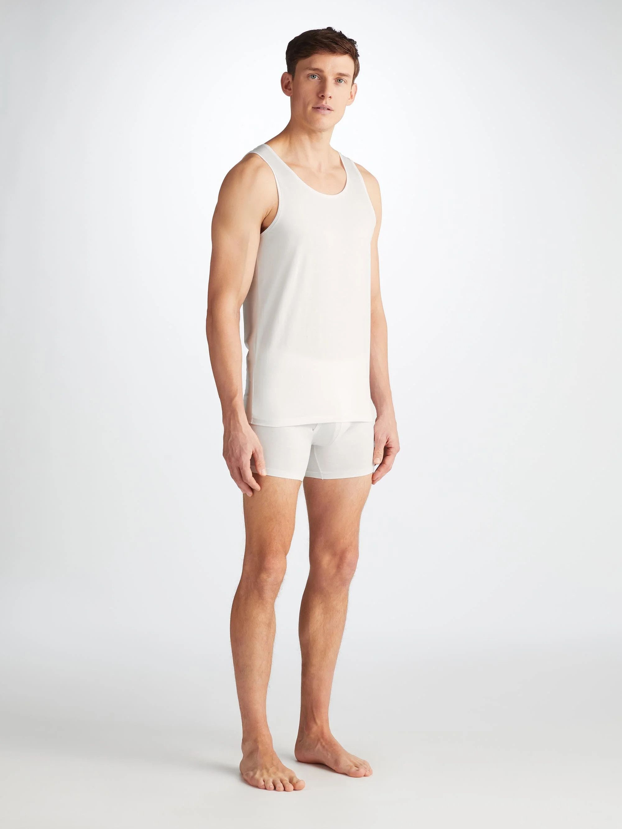 Featuring soft, narrow binding on the scooped neck and armholes that are shaped for comfort and ease of movement. An effortless underwear basic or everyday layering option. Crafted from an ultra-soft blend of 92% Pima cotton 8% elastane, that looks as good as it feels. This vest will provide a comfortable foundation for layering season after season. The model is 6'2" / 186cm tall with waist size 30” / 76cm, chest size 39” / 99cm. He wears a Medium. PRODUCT DETAILS Material: Cotton/Elastane Fabric Weight: Light Fabric Type: Jersey Gender: Men's Colour: White Pattern: Plain Sleeve Length: Sleeveless Season: CLA Neck Shape: Crew Neck Country of Origin: Albania Composition: 92% Cotton 8% Elastane Fit: Slim Fit Item Number: 8045-JACK001WHI
