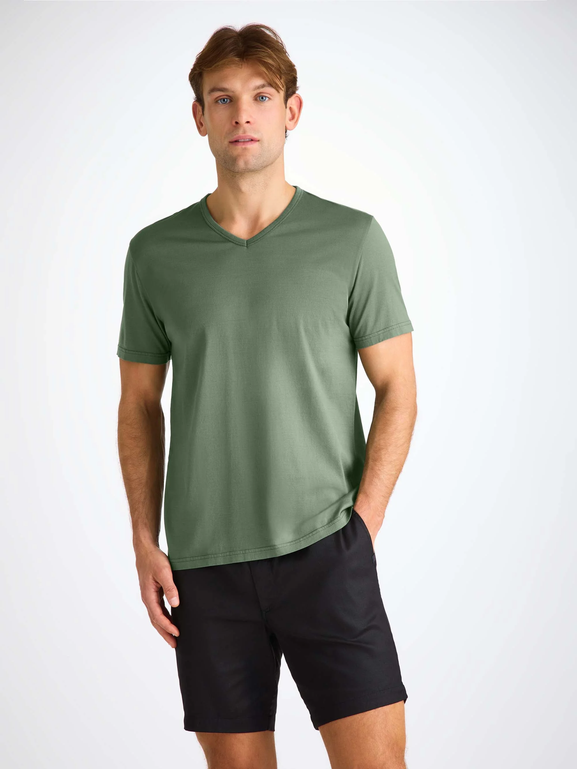 Designed in a fabric exclusive to Derek Rose, Barny is our brand new everyday wear t-shirt. Knitted in the EU, our mid weight Pima cotton t-shirt is not only breathable, but hypoallergenic. An excellent choice for any occasion. Created in a casual relaxed fit, the v-neckline features a bound collar with detailed ribbing. We have chosen to print our label inside of the neckline for optimal comfort. With twin needle cuffs and hem, our Barny t-shirt, seen here in soft green, is made for every adventure due to its durable finish. Pair with your trousers or shorts of choice for a capsule wardrobe essential. To make it truly special, we can personalise your garment with initials or a motif. Read more about our personalised service here . The model is 6’2’’ / 188.5cm tall. He wears a size Medium. PRODUCT DETAILS Material: Pure Cotton Fabric Weight: Medium Fabric Type: Jersey Gender: Men's Colour: Soft Green Pattern: Plain Sleeve Length: Short Sleeve Season: 26-S Neck Shape: V-Neck Country of Origin: Portugal Composition: 100% Cotton Fit: Regular Fit Item Number: 3183-BARN002GRE