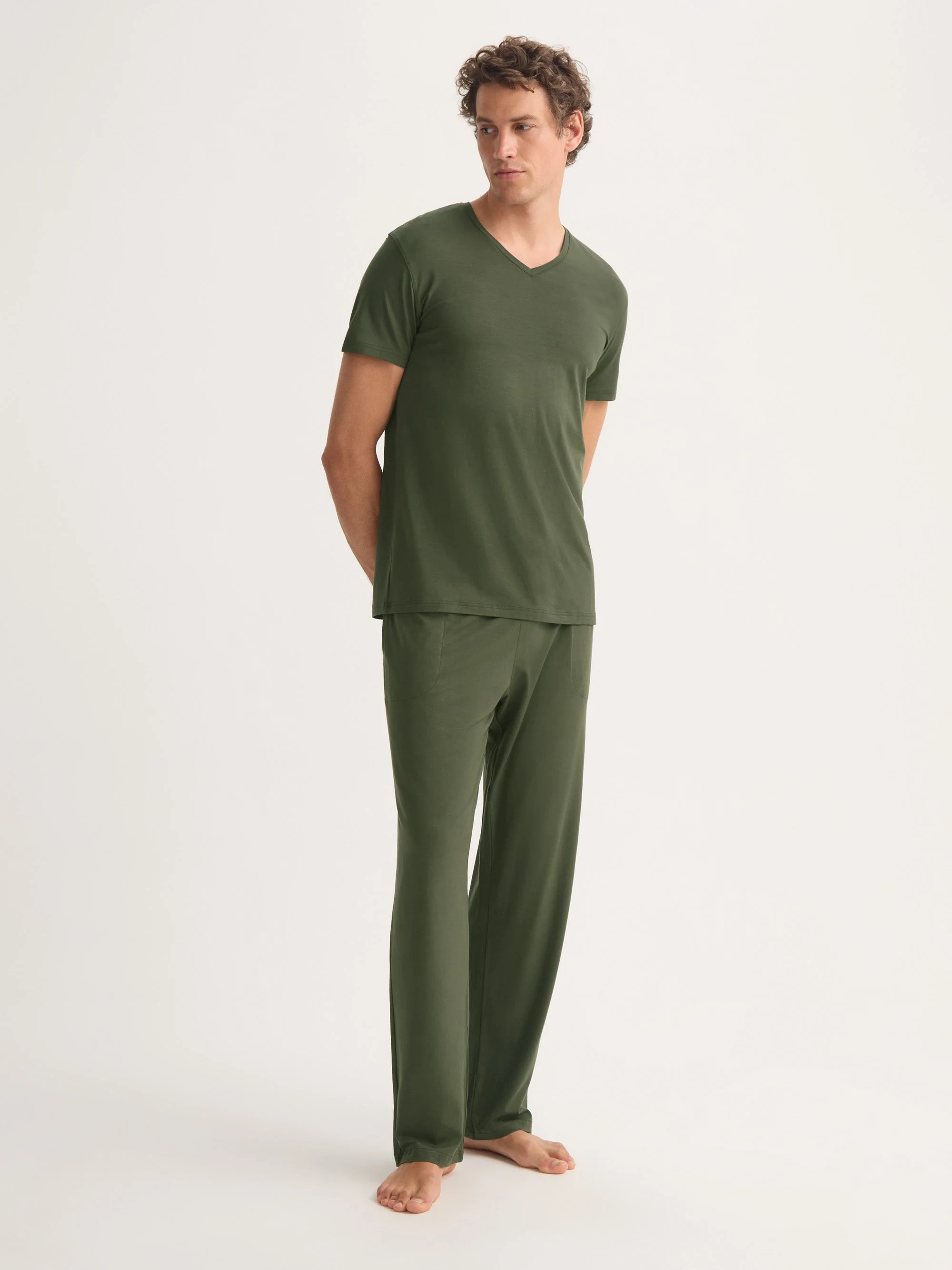 Lightweight softness with a refined V-neck finish. The Basel v-neck t-shirt combines relaxed comfort with understated luxury, making it a versatile staple for both lounging and layering. With its soft v-neck band and streamlined fit, it offers a flattering silhouette that’s as easy to wear at home as it is outside. Crafted from our signature micro modal stretch Basel, the fabric is smooth, breathable and naturally temperature-regulating, keeping you cool in the heat and warm in the cold. Exceptionally soft and resistant to pilling, it retains its shape and feel through countless wears. Sustainably made from European beech trees in a carbon-neutral process, the Basel fabric is durable, colorfast and designed to last—wash after wash. The evergreen shade adds a modern touch to this timeless wardrobe essential. Ideal for sleeping, lounging, travelling or simply upgrading your everyday basics, this v-neck tee brings effortless style to comfort. Add a personal touch with monogramming or a motif. Model is 6’1” / 188cm, wearing a size Medium. PRODUCT DETAILS Composition: 95% Modal 5% Elastane Fabric Weight: Medium Pattern: Plain Sleeve Length: Short Sleeve Neck Shape: V-Neck Country of Origin: Czech Republic Item Number: 3084-BASE022GRE