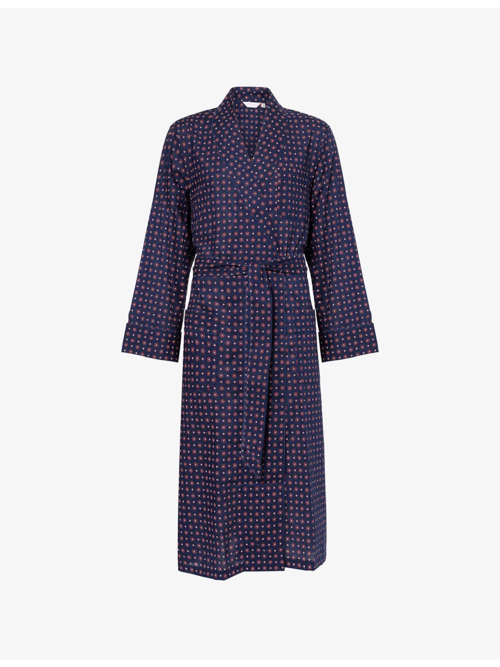 PRODUCT DETAILS - Derek Rose cotton robe - 100% cotton - Self-tie fastening - Longline, shawl lapel, long sleeves, front pockets, self belt - Machine wash mild - Model is 6ft 2in/1.88m and wears a size medium - Midweight, non-stretch Ref: R04547230