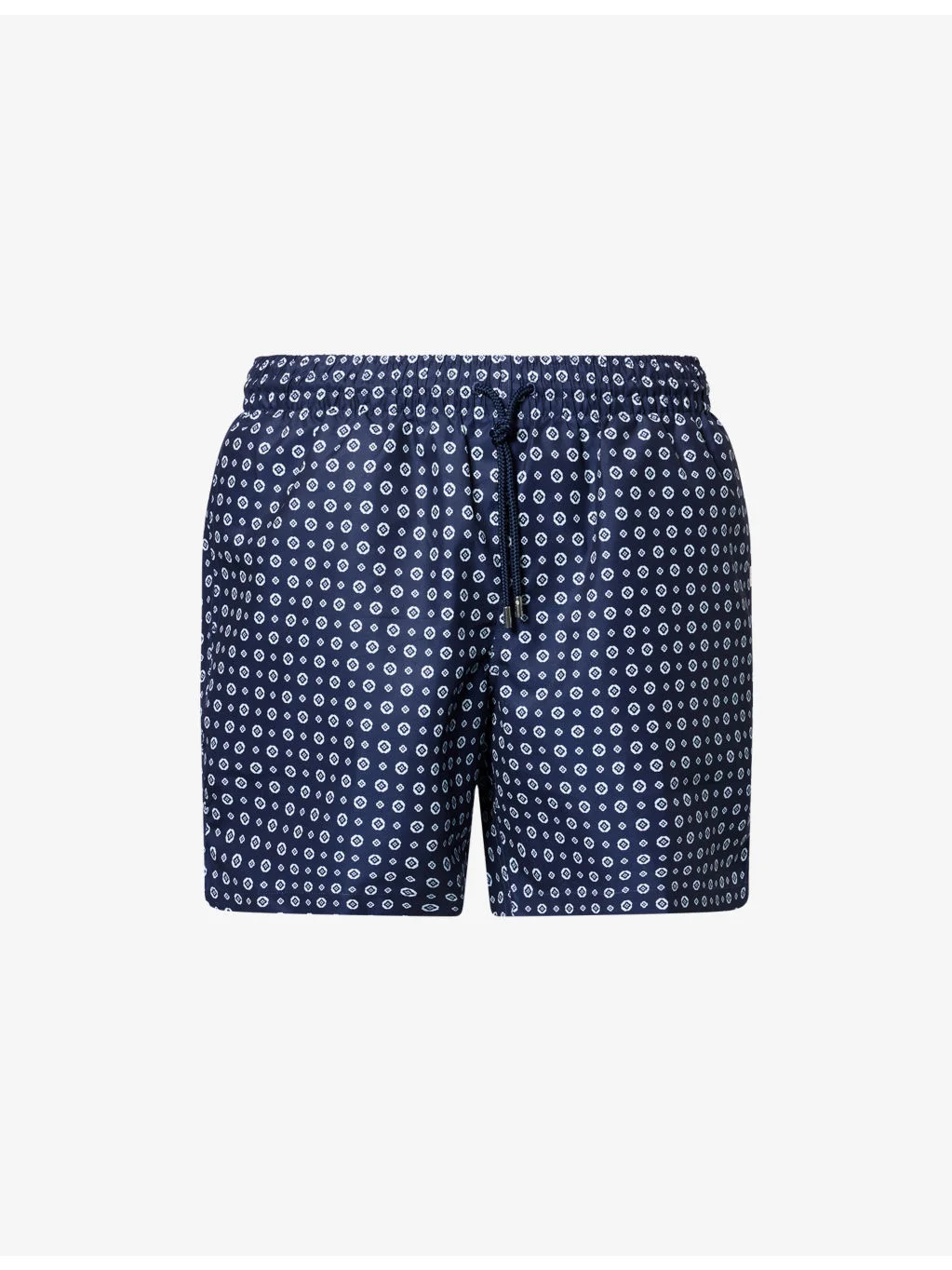 PRODUCT DETAILS - Derek Rose swim shorts - 100% polyester - Regular fit, mid-rise, drawstring elasticated waistband, slip pockets at front, embroidered tab at pocket, zip pocket at back, loop at back, internal mesh briefs, branded hardware - Machine wash cold - Model is 6ft 2in/1.88m and wears a size medium - Lightweight, non-stretch - Comes with drawstring dust bag Ref: R04551831
